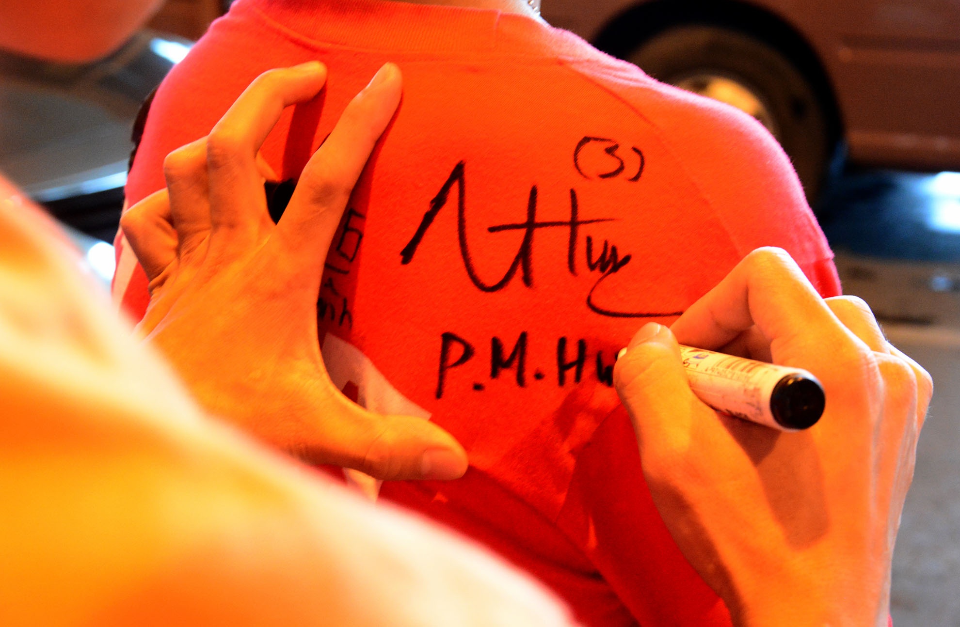 | Hậu vệ Phạm Mạnh Hùng ký lên áo người hâm mộ với số áo đấu của anh. |