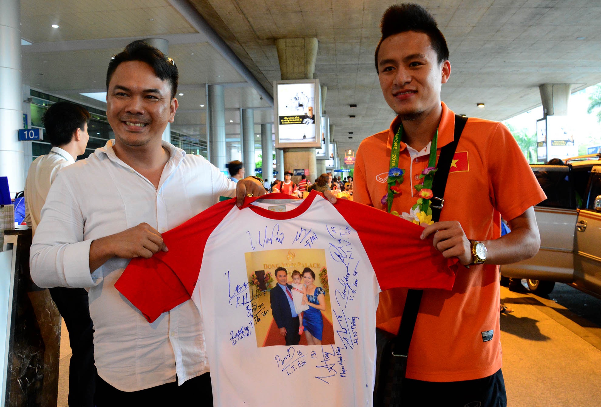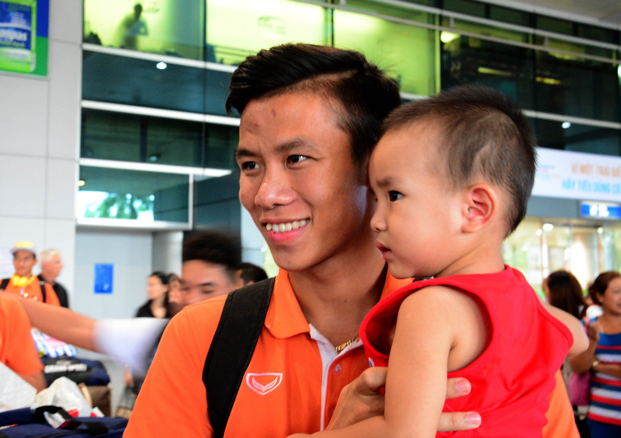 | Đội trưởng Quế Ngọc Hải chụp hình chung với con của một CĐV ở TP HCM. Ban huấn luyện và các cầu thủ hân hoan khi chứng kiến sự chào đón nồng nhiệt của người hâm mộ. Hình ảnh thi đấu nỗ lực như một chiến binh của hậu vệ người Nghệ An chứng minh anh xứng đáng với tấm băng đội trưởng. |