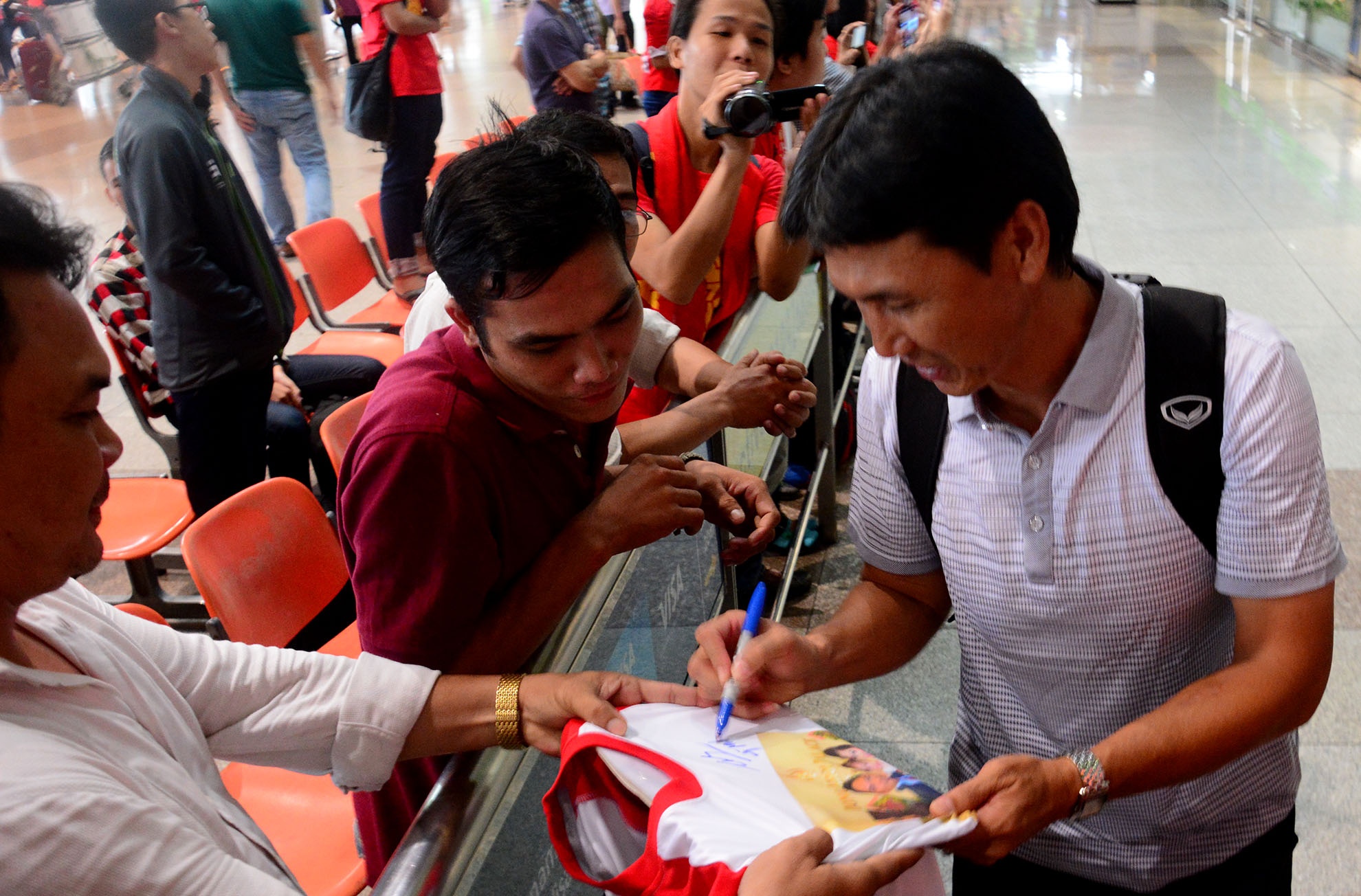 Người hâm mộ chờ nhận chữ ký của thủ quân U23 Việt Nam Quế Ngọc Hải. Sau trận tranh HCĐ, Hải đã "lột sạch đồ" tặng CĐV.