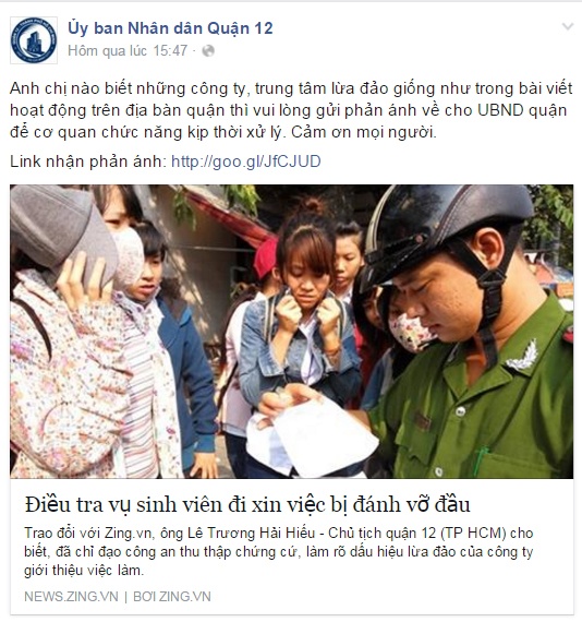 Trang Facebook của UBND quận 12 đăng thông tin kêu gọi nạn nhân cung cấp thông tin về các công ty giới thiệu việc làm lừa đảo từ bài báo của Zing.vn. |
