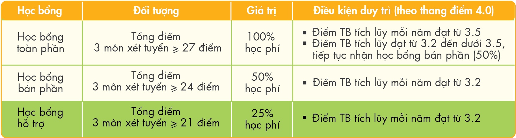 Năm nay, chính sách học bổng của UEF đã mở rộng đối tượng đồng thời tăng cao giá trị bằng nhiều suất như 100%, 50% và 25%. Cụ thể, thí sinh tham gia xét tuyển và trúng tuyển vào trường năm nay theo hai phương thức: xét tuyển theo kết quả thi THPT quốc gia và xét tuyển theo học bạ THPT (lớp 12) sẽ nhận ngay các mức học bổng tương xứng.
