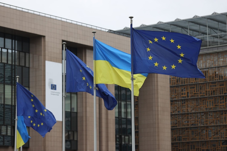 Cờ Liên minh châu Âu và cờ Ukraine tại trụ sở Ủy ban châu Âu ở Brussels, Bỉ. Ảnh: THX/TTXVN. |