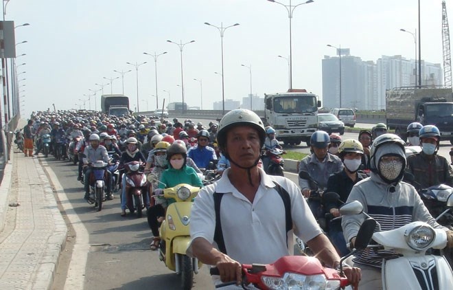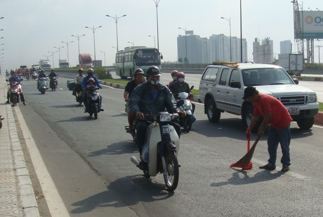 | Khoảng 14h30 ngày 18/1, có người rải đinh trên cầu Rạch Chiếc khiến dòng xe gắn máy qua đây phải di chuyển chậm chạp để tránh đinh nên đã gây ùn ứ trên cầu. |