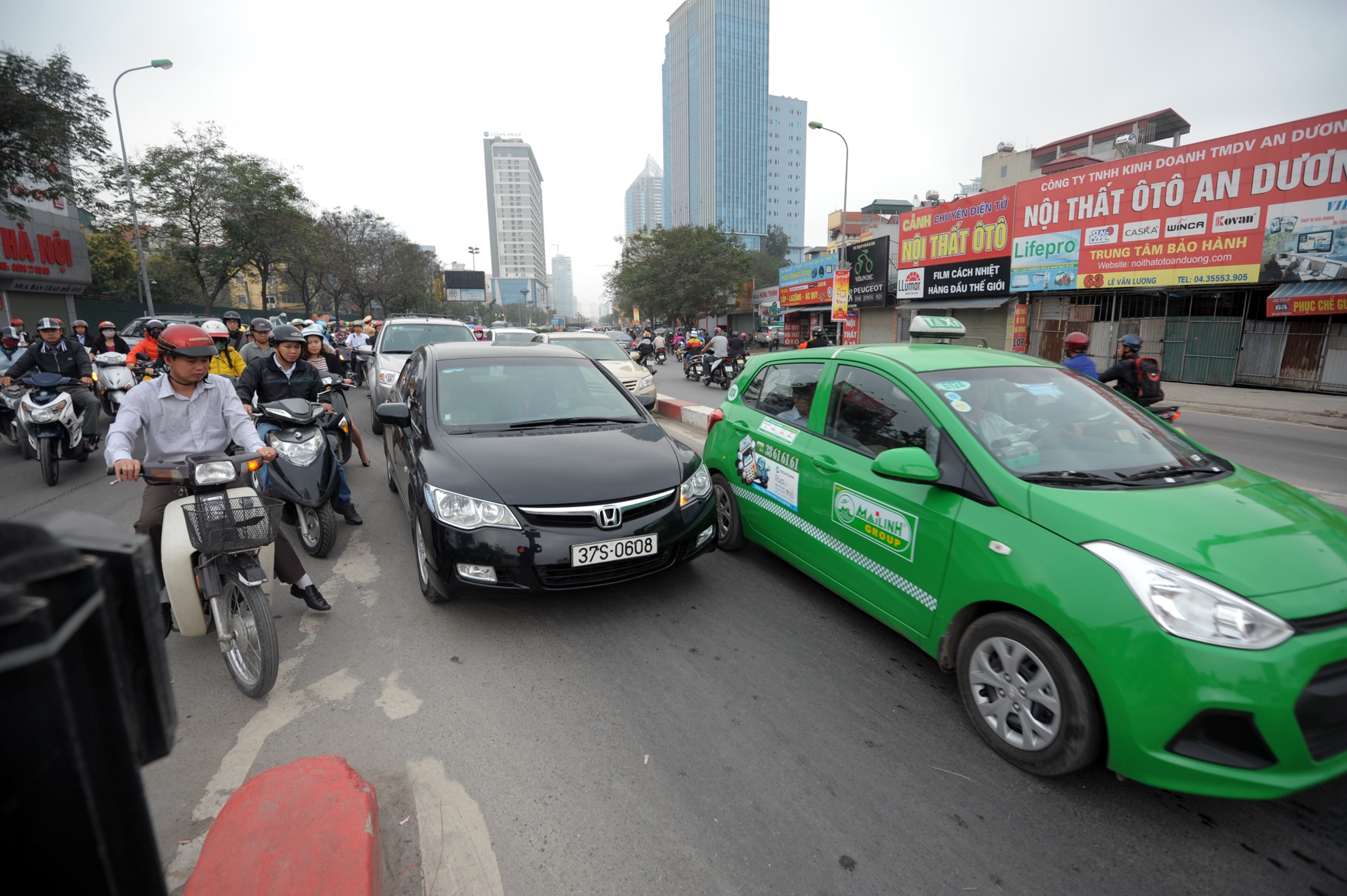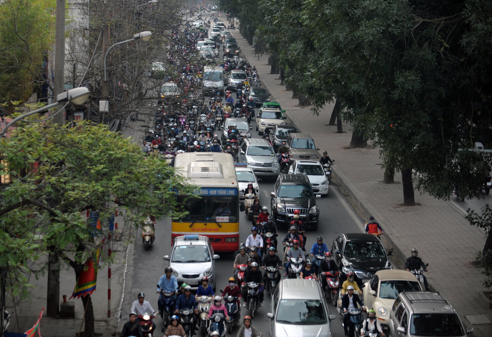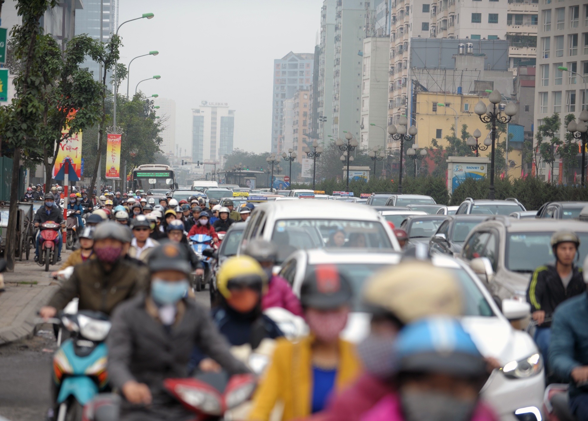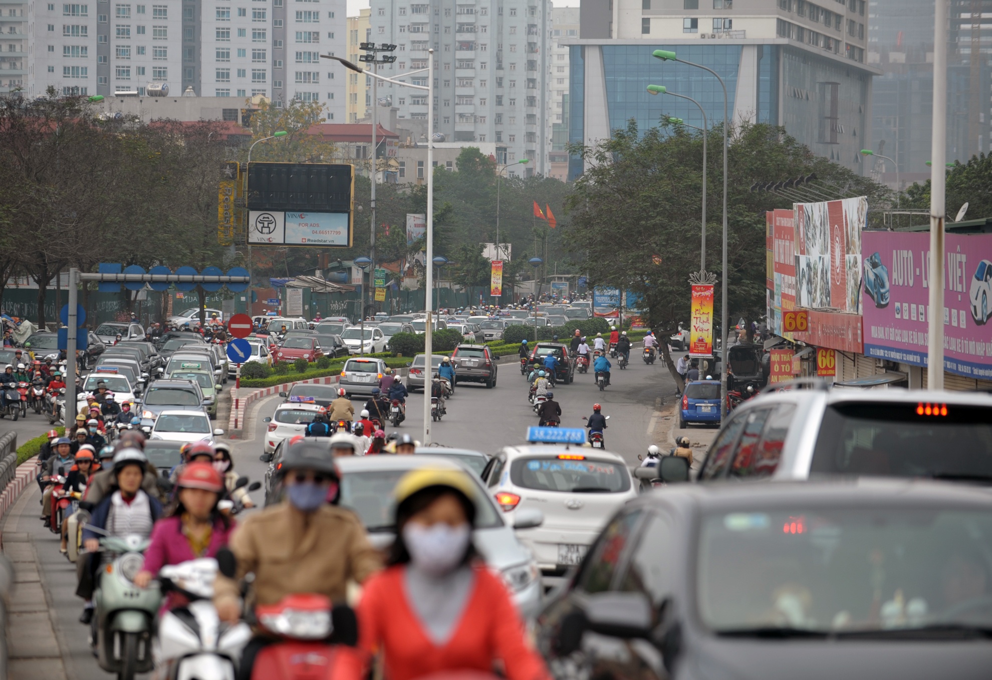 | Giao thông ùn tắc kéo dài từ ngã tư Lê Văn Lương - Hoàng Minh Giám tới chân cầu vượt Láng Hạ. |