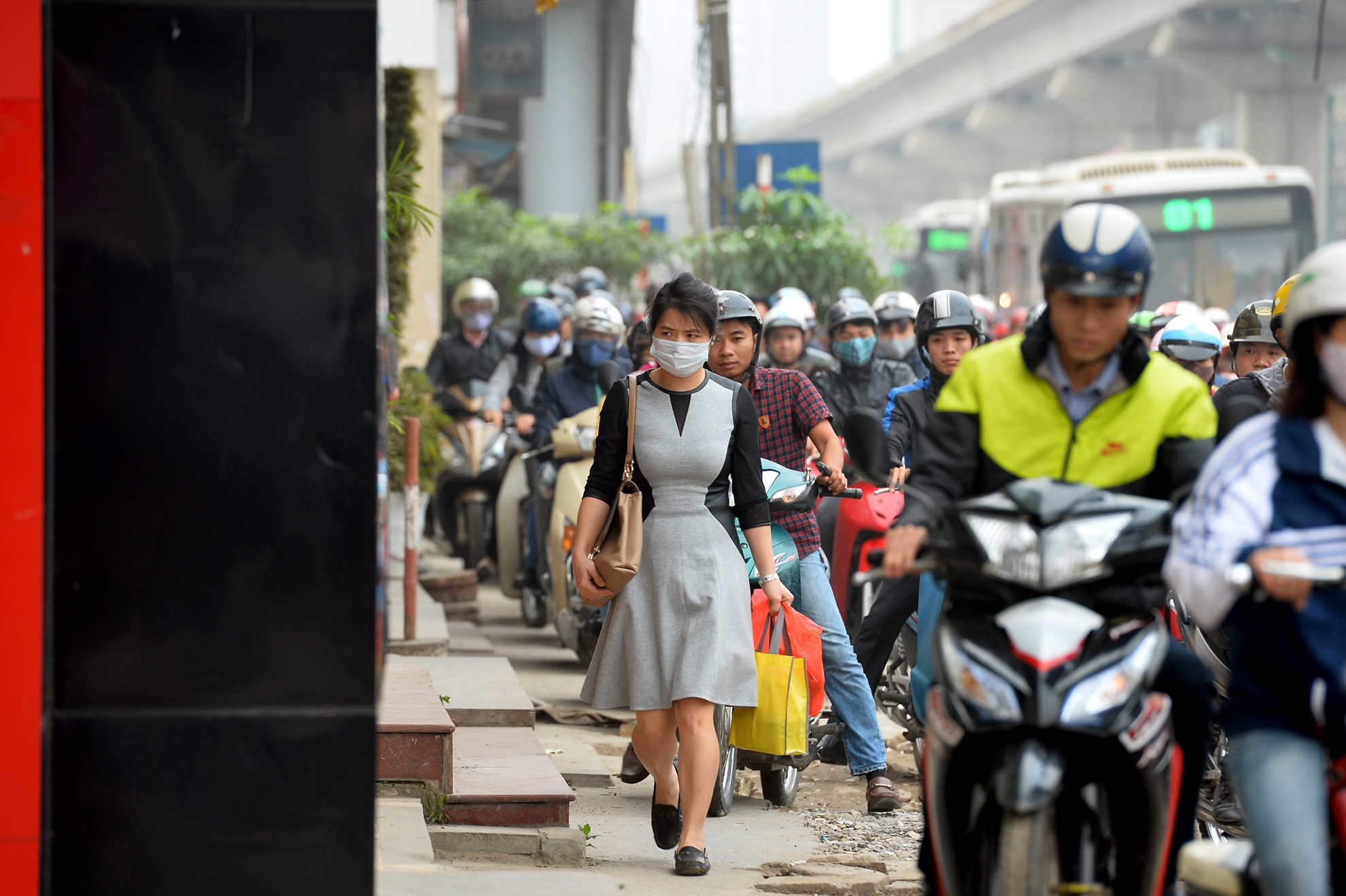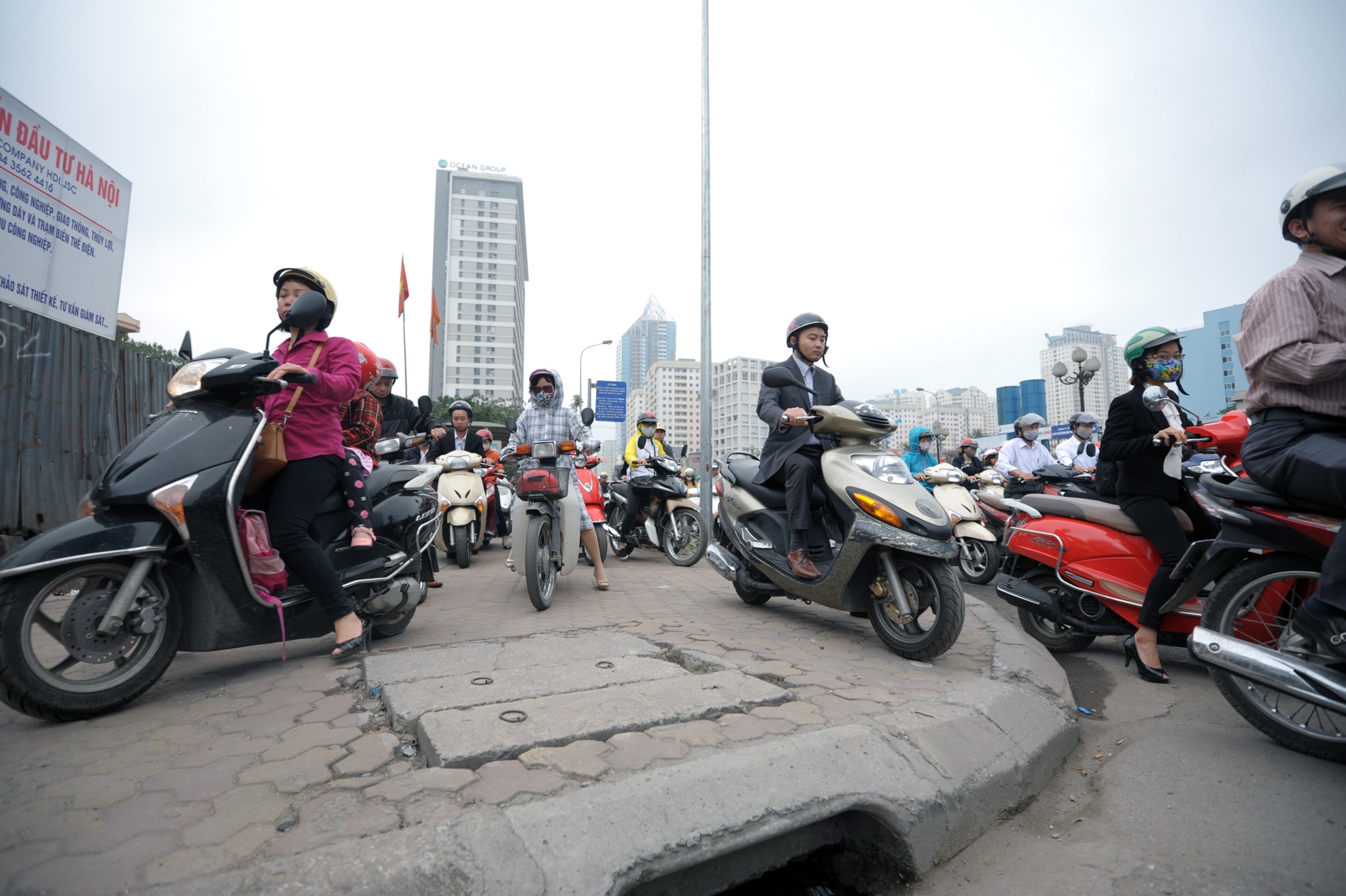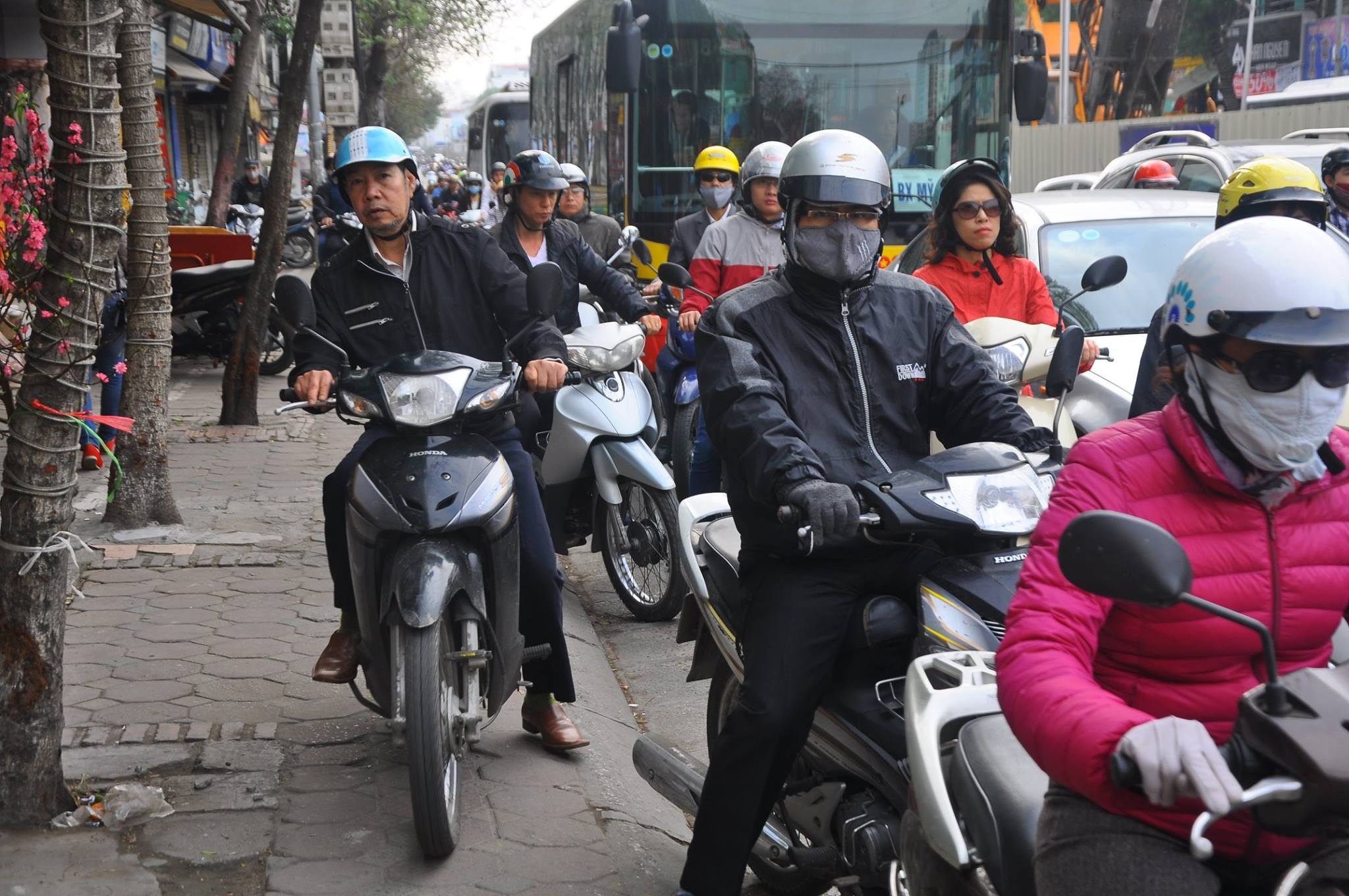 | Nhiều xe máy phải đi lên vỉa hè để nhanh chóng vượt qua đám đông. |