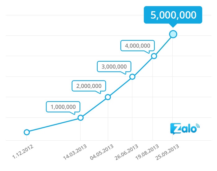 Thường xuyên đứng đầu bảng xếp hạng download của các kho ứng dụng trên bốn nền tảng iOS, Android, Nokia và Windows Phone từ đầu năm đến nay, Zalo đã có những bước tiến nhanh về số lượng người dùng. Sau khi đạt 4 triêu hôm 19/8, 35 ngày sau tức 25/9, ứng dụng này đã vượt mốc 5 triệu.