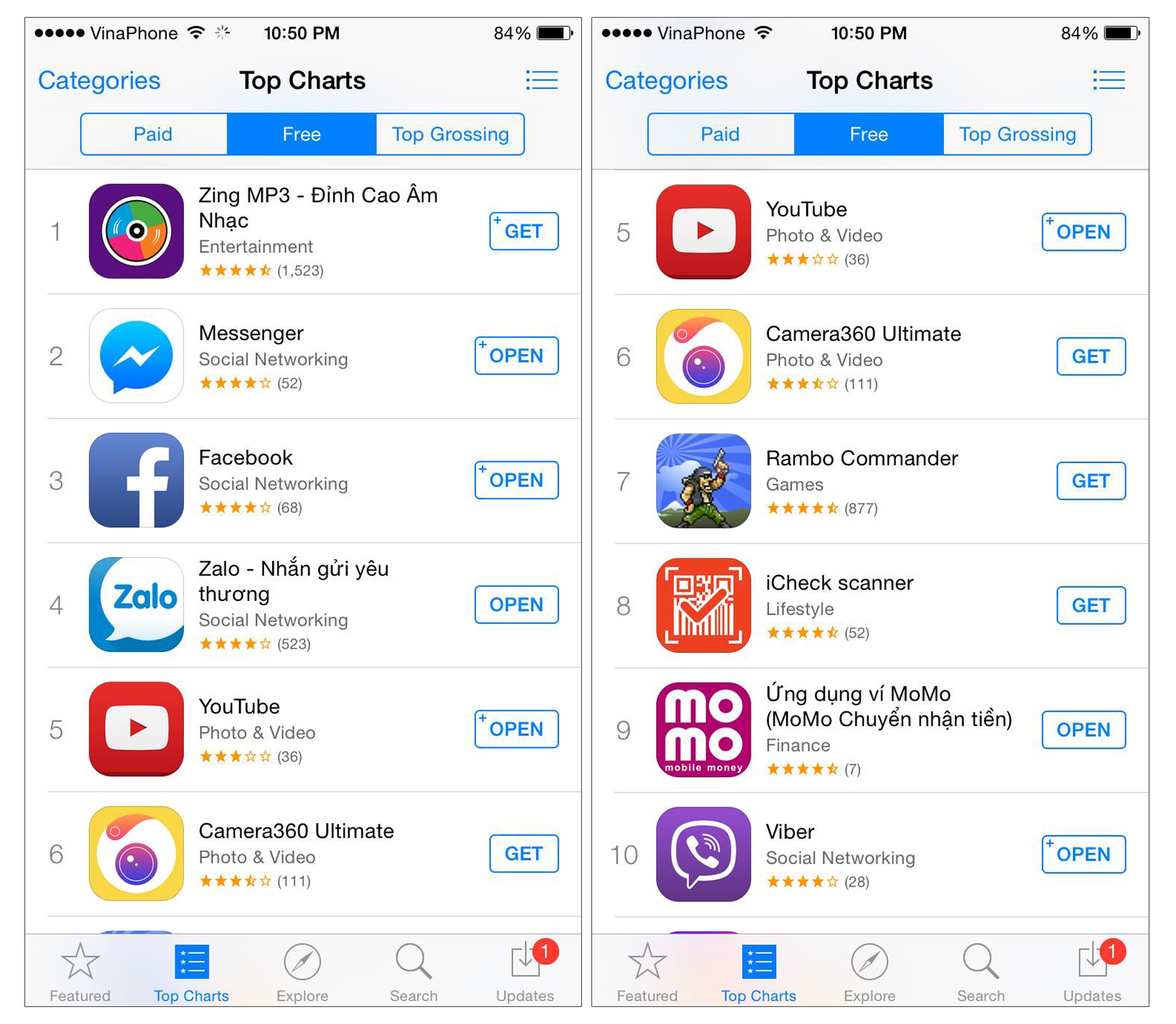 MoMo là ứng dụng tài chính có vị trí cao nhất trên App Store khu vực Việt Nam. Hiện phần mềm này đứng vị trí thứ 9, trên Viber và chung nhóm với các tiện ích của Facebook, Zalo, Zing MP3.