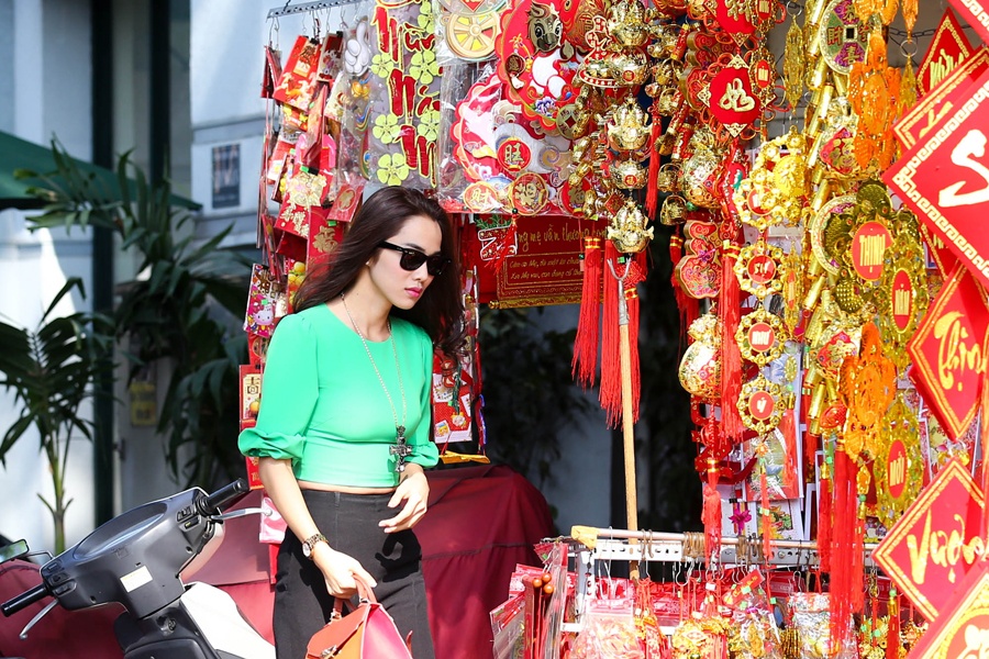 Kim Cương tiến tới một gian hàng bán đồ trang trí Tết và phong bao lì xì.