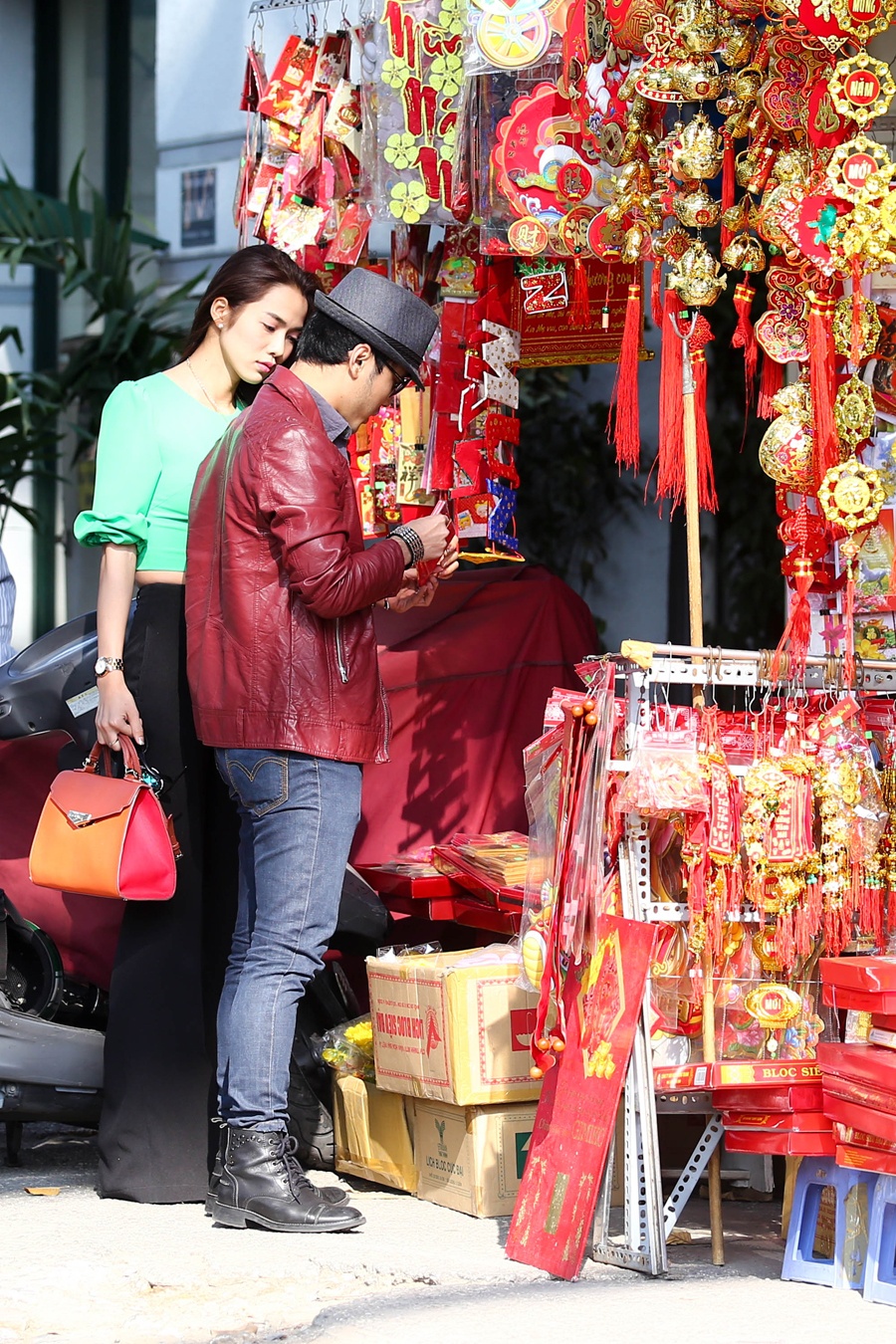 Nam ca sĩ ''Thà rằng như thế'' dừng xe lại bên lề đường để bạn gái chọn mua những món đồ trang trí dịp Tết.