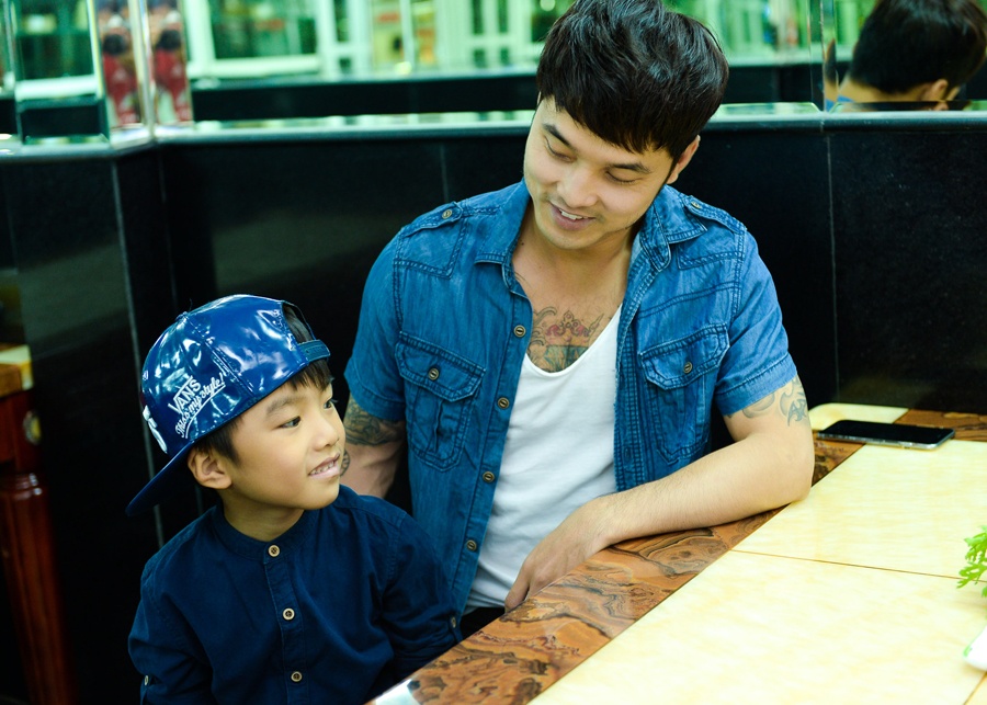 Chủ nhật vừa qua, nam ca sĩ đưa Hưng Phát đến một nhà hàng quen thuộc dùng bữa sáng. Đây cũng là lần hiếm hoi anh công khai hình ảnh thân thiết cùng con trai Kim Cương. Gia đình cựu thành viên 1088 diện trang phục tông màu xanh đồng điệu.
