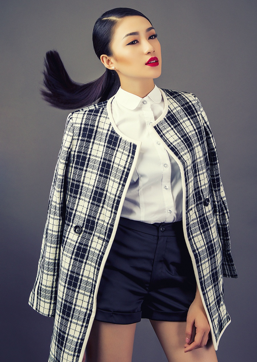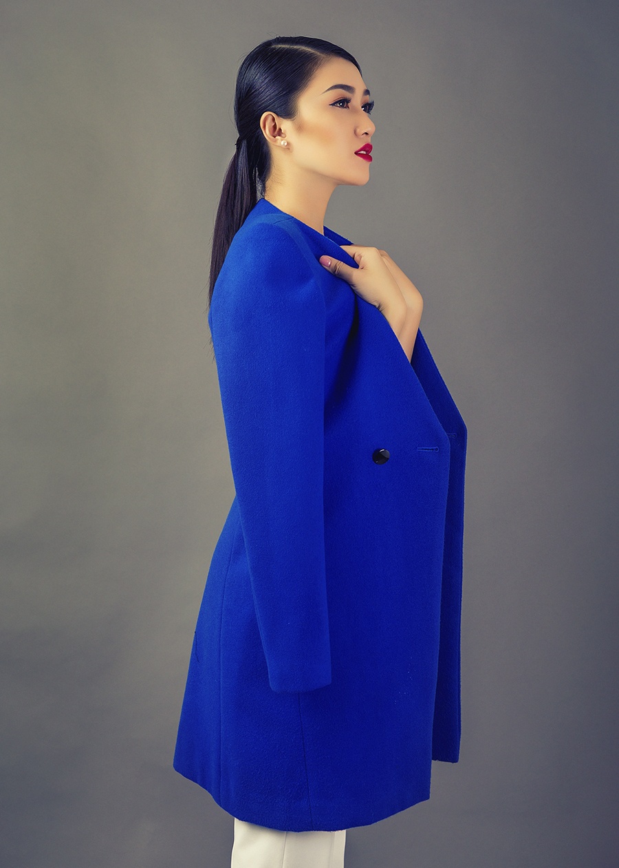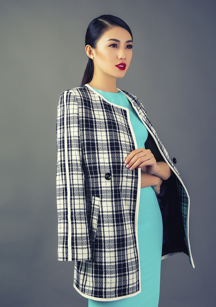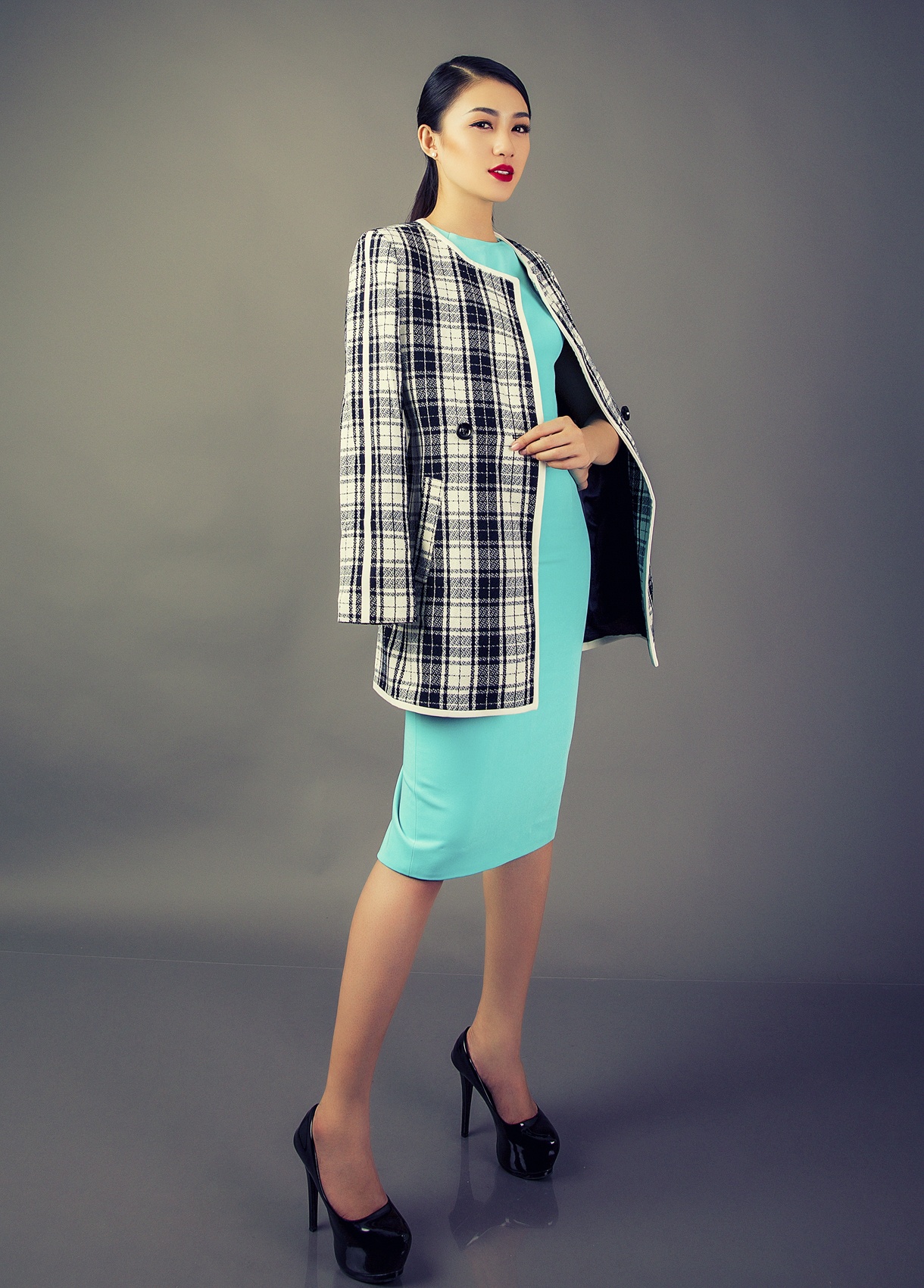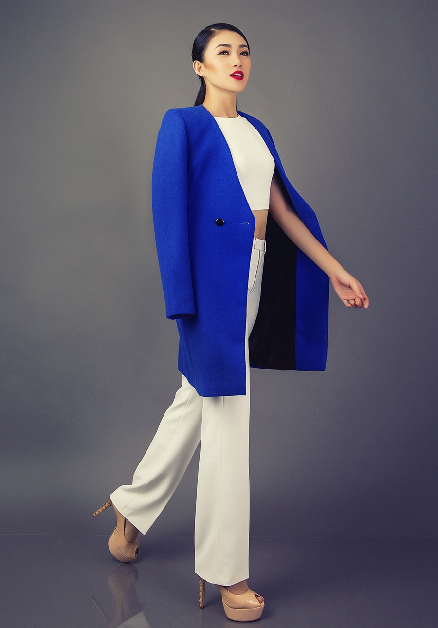 | Ứng viên sáng giá tại cuộc thi Hoa hậu Việt Nam 2014 ướm những kiểu mốt hợp xu hướng. Trang phục ôm dáng, để lộ dường cong gợi cảm. Áo khoác hờ làm điểm nhấn cho tổng thể hợp mốt. |