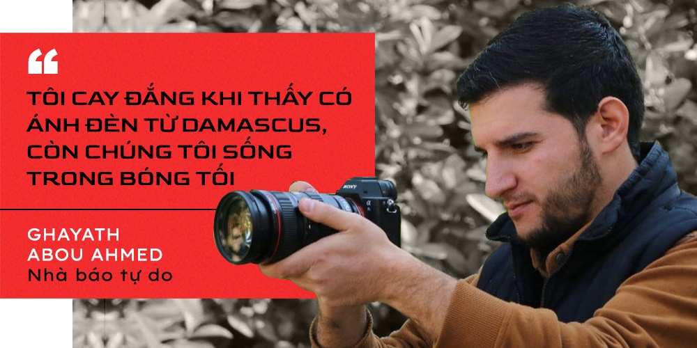 “Tôi thấy cay đắng mỗi khi nhìn về chân trời và thấy ánh đèn sáng rực từ Damascus, còn chúng tôi thì sống trong bóng tối. Họ (nhóm người ủng hộ chính quyền Assad) tự do đi lại, trong khi chúng tôi không có thực phẩm, thuốc men”, anh nói.
