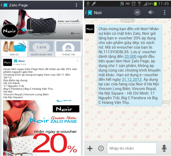 Ngay sau khi nhấn nút quan tâm, người dùng sẽ nhận được tin nhắn từ chương trình thông báo tham gia thành công cùng mã số mua hàng ưu đãi. Các tín đồ thời trang chỉ cần đến các cửa hàng Noir trong phạm vi khuyến mãi, thông báo mã số phiếu mua hàng và chọn sản phẩm mình yêu thích.