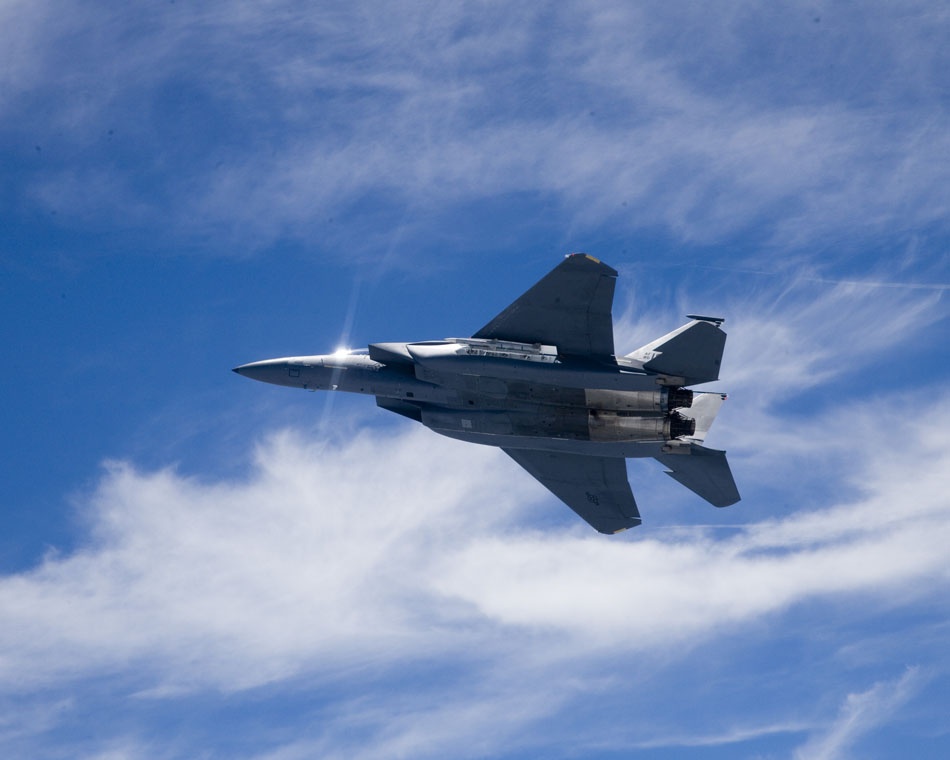Sở hữu 2 động cơ phản lực Pratt & Whitney F100-229, phi cơ F-15SE Silent Eagle bay với vận tốc Mach 2.5+ (tương đương 2.650+ km/h). Trần bay tối đa của F-15SE Silent Eagle đạt 18.200 m trong khi tốc độ lên cao đạt 254+ m/s. F-15SE Silent Eagle có khả năng mang tên lửa đối đất, đối không, bom các loại nhờ các giá treo dưới cánh, bụng hoặc khoang chứa bên trong thân. Ảnh: flightglobal.com.