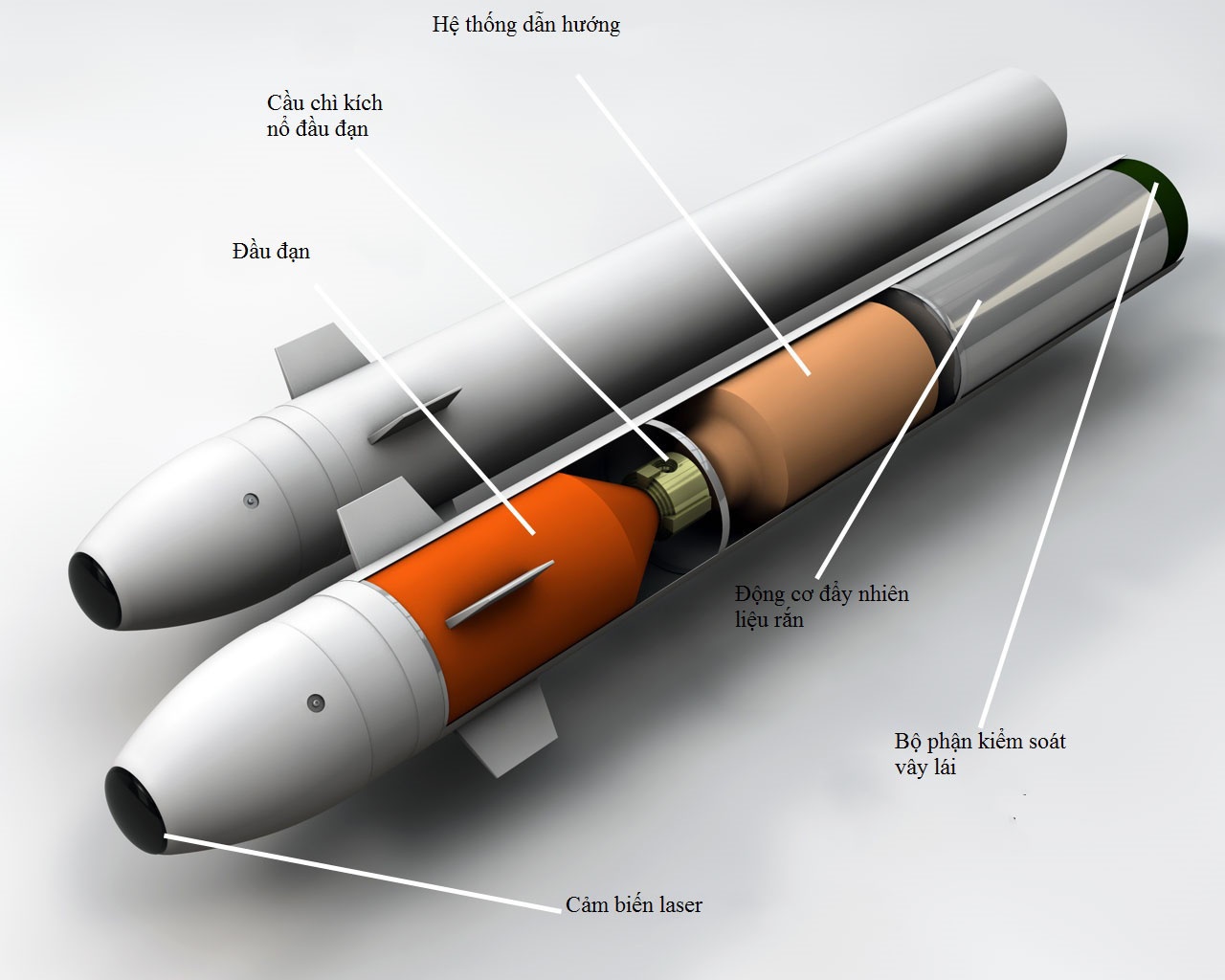 | Cấu tạo và các bộ phận của tên lửa Hellfire. Tên lửa có chiều dài 1,63 m, đường kính 178 mm, trọng lượng phóng 45 đến 49 kg. Ảnh đồ họa: Boeing |
