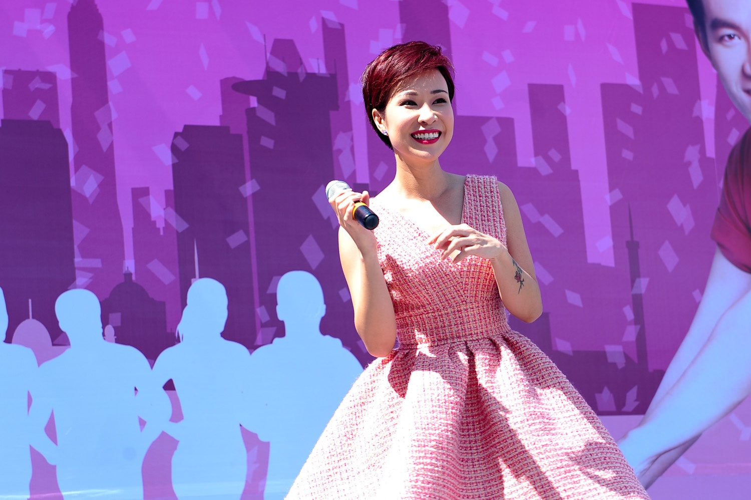 | Bộ váy được cắt xẻ sâu phần lưng giúp quán quân Vietnam Idol khoe khéo hình xăm thể hiện sự mạnh mẽ của mình. Ngoài hình xăm lớn có biểu tượng lông vũ, trên cánh tay của nữ ca sĩ còn có xăm hình chùm hoa đào và một dòng chữ lạ. |