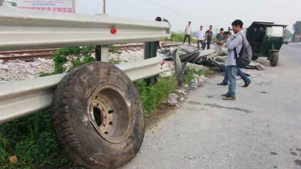 | Vụ va chạm mạnh khiến bánh xe rơmooc rơi ra ngoài. |