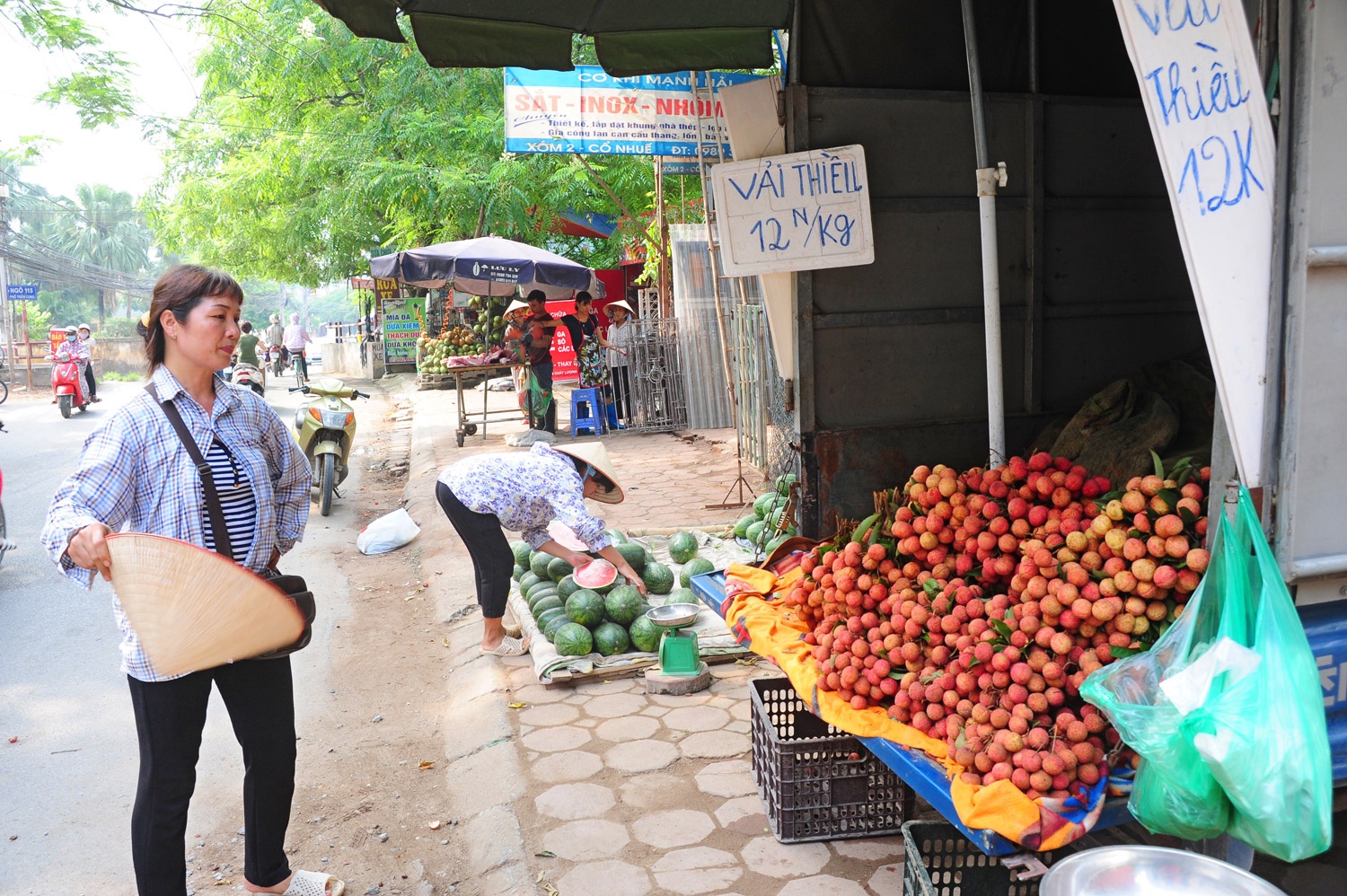 Tại phố Lương Định Của, hàng vải của chị Minh (Phú Xuyên, Hà Nội) giữa trưa nắng vẫn có khách mua. Chị Minh cho biết, khách đến mua vải chị luôn khuyến khích ăn thử để biết đó là vải Bắc Giang chính gốc. Mức giá cho mỗi kg vải chị Minh bán dao động 10.000-12.000 đồng.