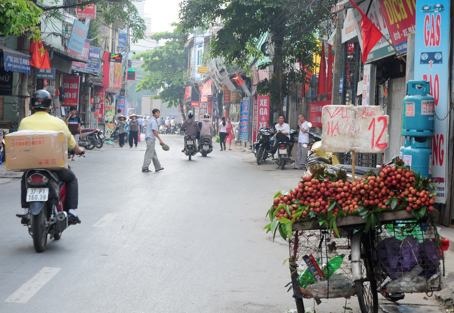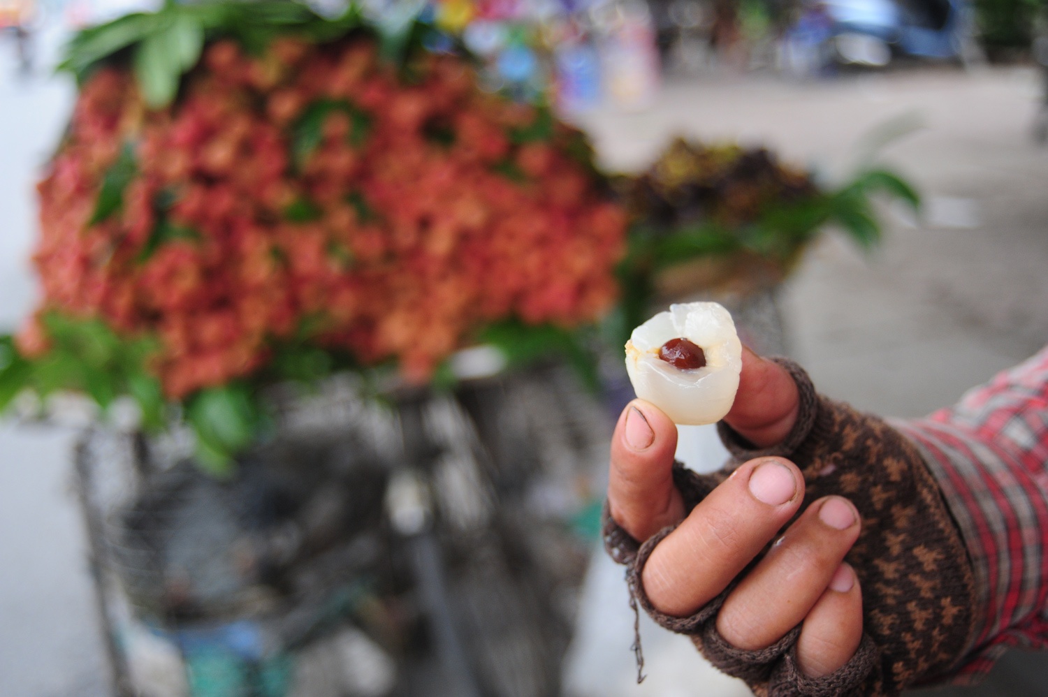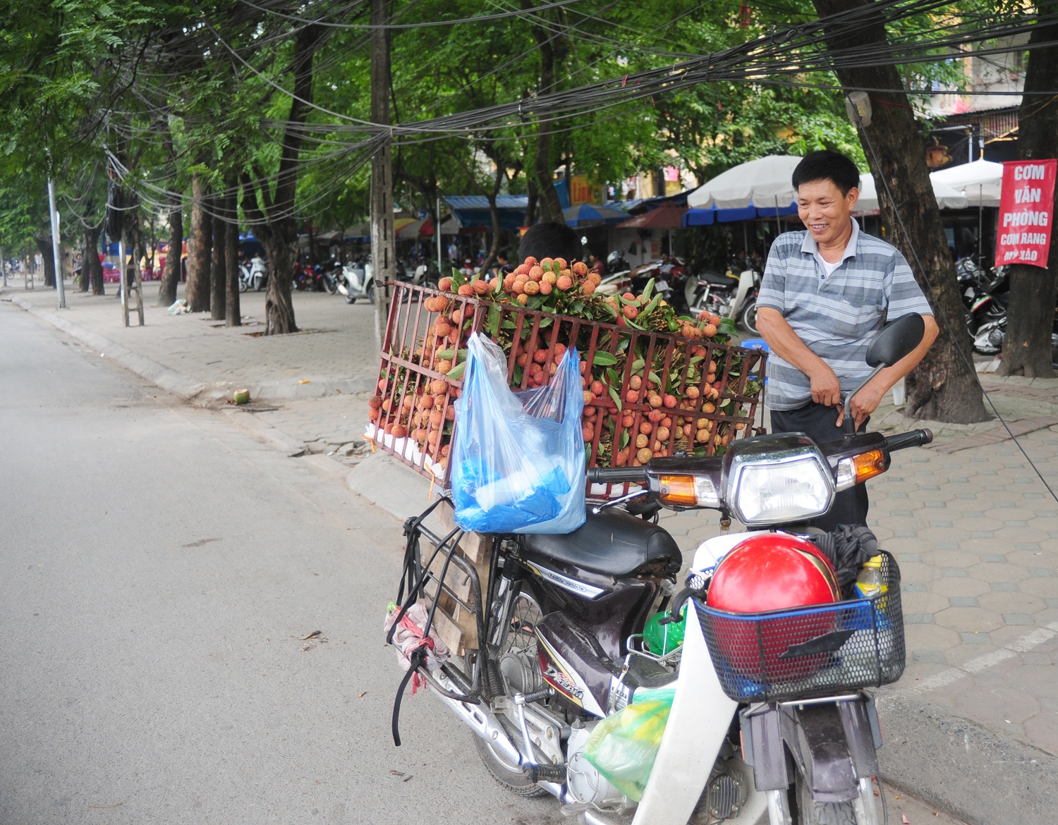 Chị Xuân, Quê ở Văn Giang, Hưng Yên có chồng bị tai biến liệt nửa người 3 năm nay. Trong gia đình, chị là lao động chính, nuôi chồng và 2 con đang học đại học. Hàng ngày, 3h sáng, chị Xuân ra chợ Long Biên lấy hàng rồi đi bán dạo quanh Hà Nội. Chị cho biết, giá vải nhập vào khoảng 7.000 đồng/kg, giá bán ra 10.000-12.000 đồng/kg. "Mấy hôm nay vải đắt hơn, nhập vào 8.000 đồng/kg, bán ra vẫn chỉ 12.000-13.000 đồng/kg nhưng khá hao. Mình chở bằng xe đạp thồ nên không chở được nhiều, Hôm nào đắt hàng thì bán được khoảng 80kg, còn hôm ế hàng thì chỉ được 30-40kg. Lời lãi không được bao nhiêu, chưa kể đến việc bị bắt 5 lần vì quy định cấm bán hàng rong trên phố, toàn mất trắng", chị nói.