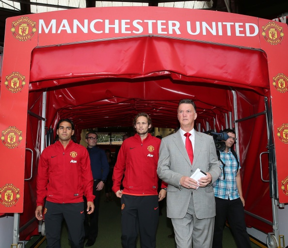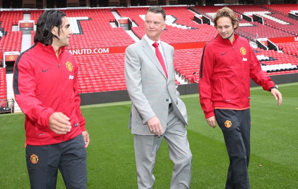 | Giây phút các Manucian chờ đợi đã đến. HLV Louis van Gaal dẫn 2 tân binh gia nhập M.U trong ngày cuối cùng của kỳ chuyển nhượng mùa hè 2014, Radamel Falcao và Daley Blind bước ra khỏi đường hầm sân Old Trafford. |