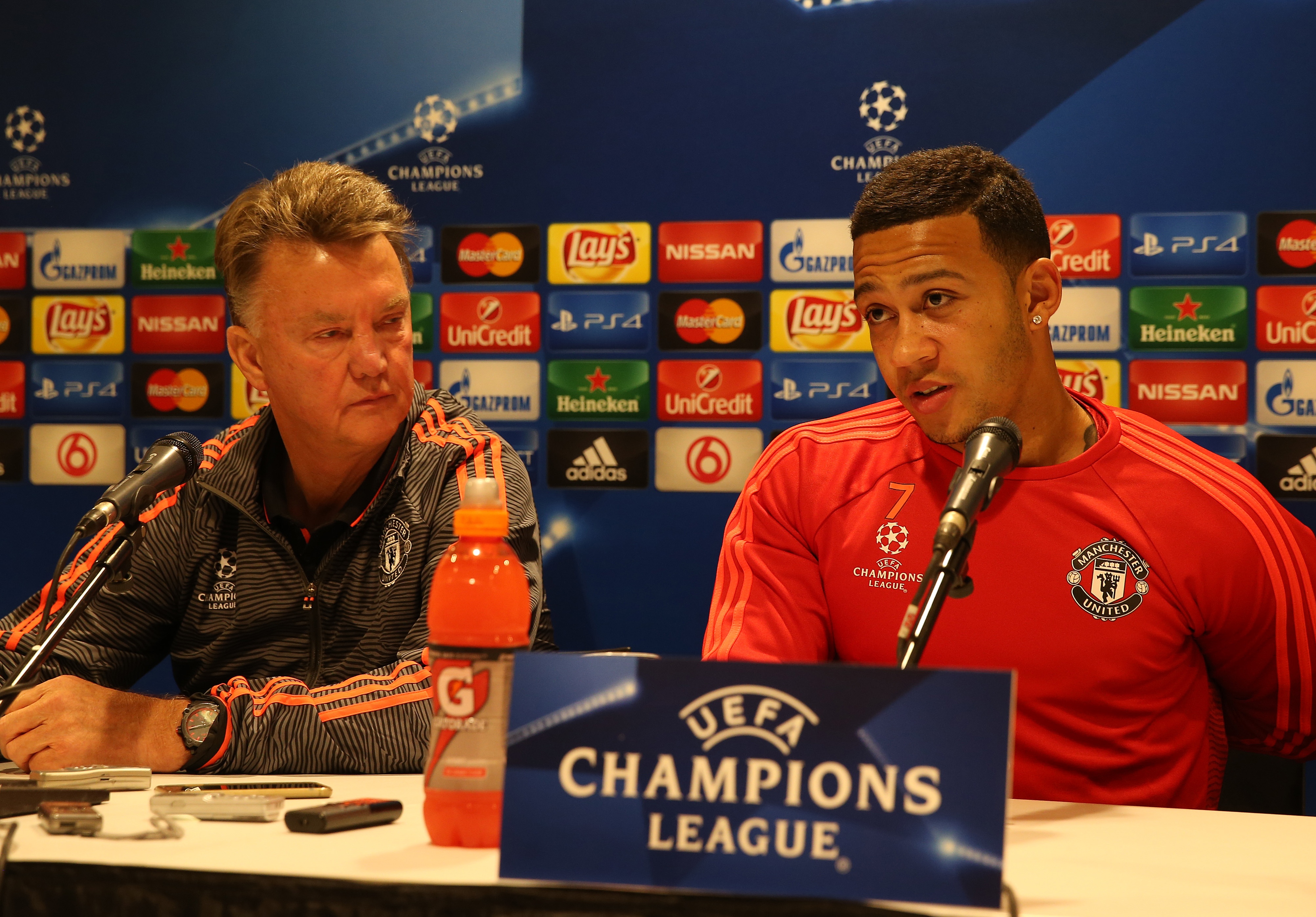 | HLV Van Gaal và tiền đạo Memphis Depay trả lời trong buổi họp báo trước trận gặp PSV ở vòng bảng Champions League. Ảnh: Man United. |