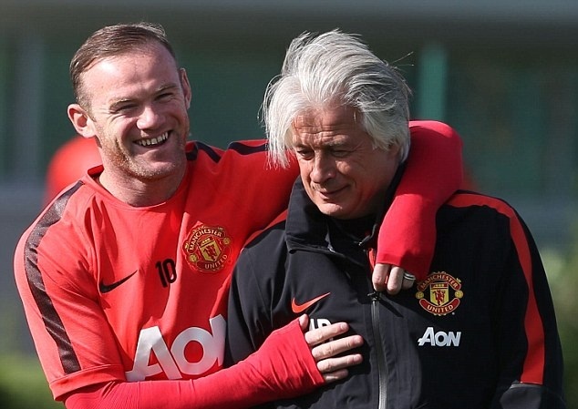 | Đội trưởng Rooney tỏ ra rất thân mật với trợ lý HLV Marcel Bout. |