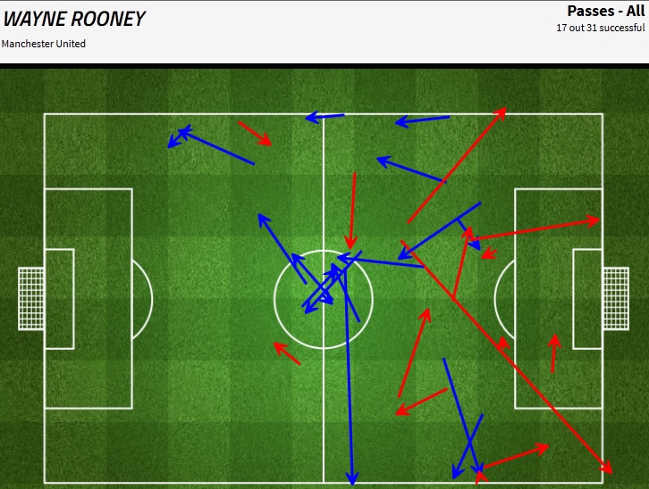Trong 90 phút có mặt trên sân, thủ quân MU chỉ tung ra một cú sút từ ngoài khu vực 16,5 m, nhưng bị hậu vệ đối phương chặn lại. Ngoài ra, Rooney có tổng cộng 31 đường chuyền, trong đó 14 pha chuyền không chính xác.