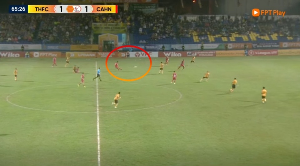 Bàn gỡ của Alan trước đó giải tỏa áp lực cho CAHN, nhưng phải đến phút 66, trận đấu mới thực sự rẽ sang hướng khác. Trong một tình huống tưởng chừng không quá nguy hiểm, Văn Hậu quan sát rất nhanh vị trí của thủ môn Xuân Hoàng. Thấy người gác đền Thanh Hóa dâng cao, hậu vệ trái của CAHN quyết định tung cú dứt điểm ngay từ khu vực gần giữa sân.