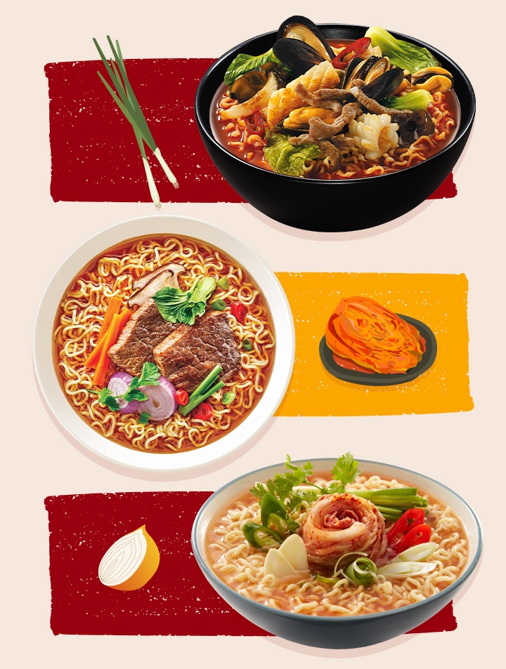 Các sản phẩm của thương hiệu được làm từ bột mì nguyên chất, sử dụng phẩm màu tự nhiên, ít tẩm ướp gia vị và chiên bằng nhiệt độ thấp trong dầu thực vật. Bằng cách thêm các thành phần khác nhau, người Hàn đã biến đổi món mì ăn liền quen thuộc thành một bữa ăn cân bằng và dinh dưỡng. Các nguyên liệu thường được người Hàn cho vào mì là giá đỗ, bột đậu, sữa, thịt hay thậm chí là nước ngọt để tạo nên sự phá cách của món ăn.