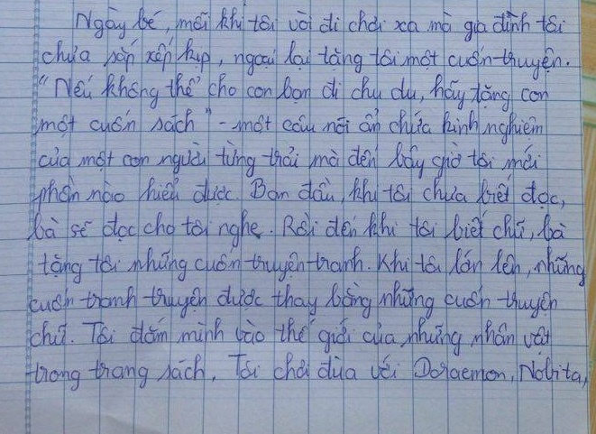 Ban đầu, khi tôi chưa biết đọc, bà sẽ đọc cho tôi nghe. Rồi đến khi tôi biết chữ, bà tặng tôi những cuốn truyện tranh. Khi tôi lớn lên, những cuốn truyện tranh được thay bằng những cuốn truyện chữ. Tôi đắm mình vào thế giới của những nhân vật trong trang sách. Tôi chơi đùa với Doraemon, Nobita, tôi say mê theo dõi từng bước chân trong chuyến hành trình của Red và những chú quái vật bỏ túi của cậu.