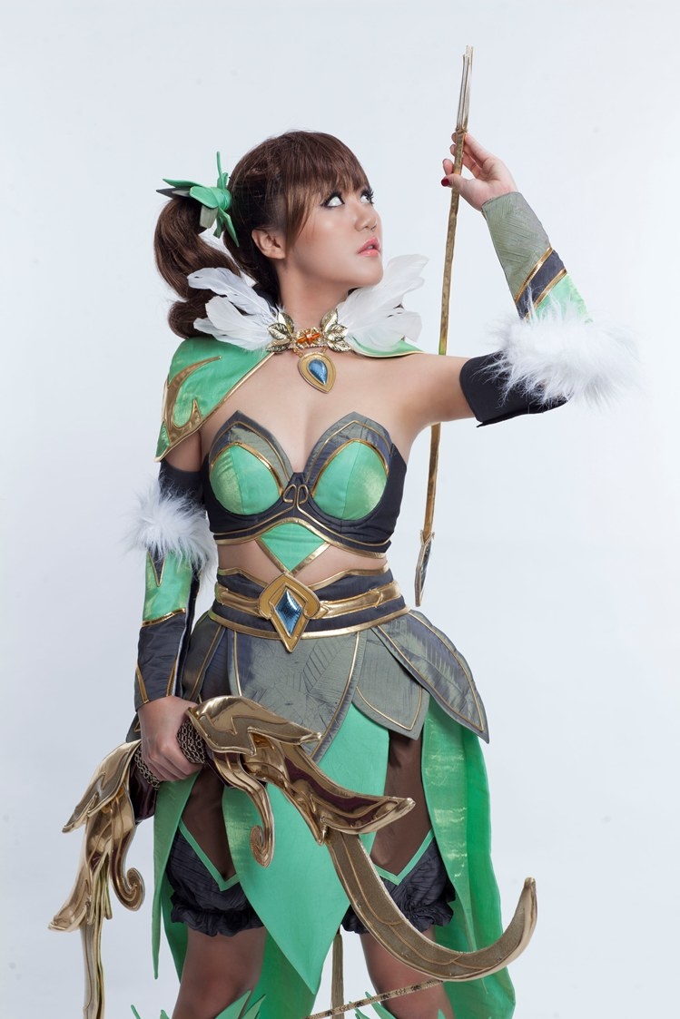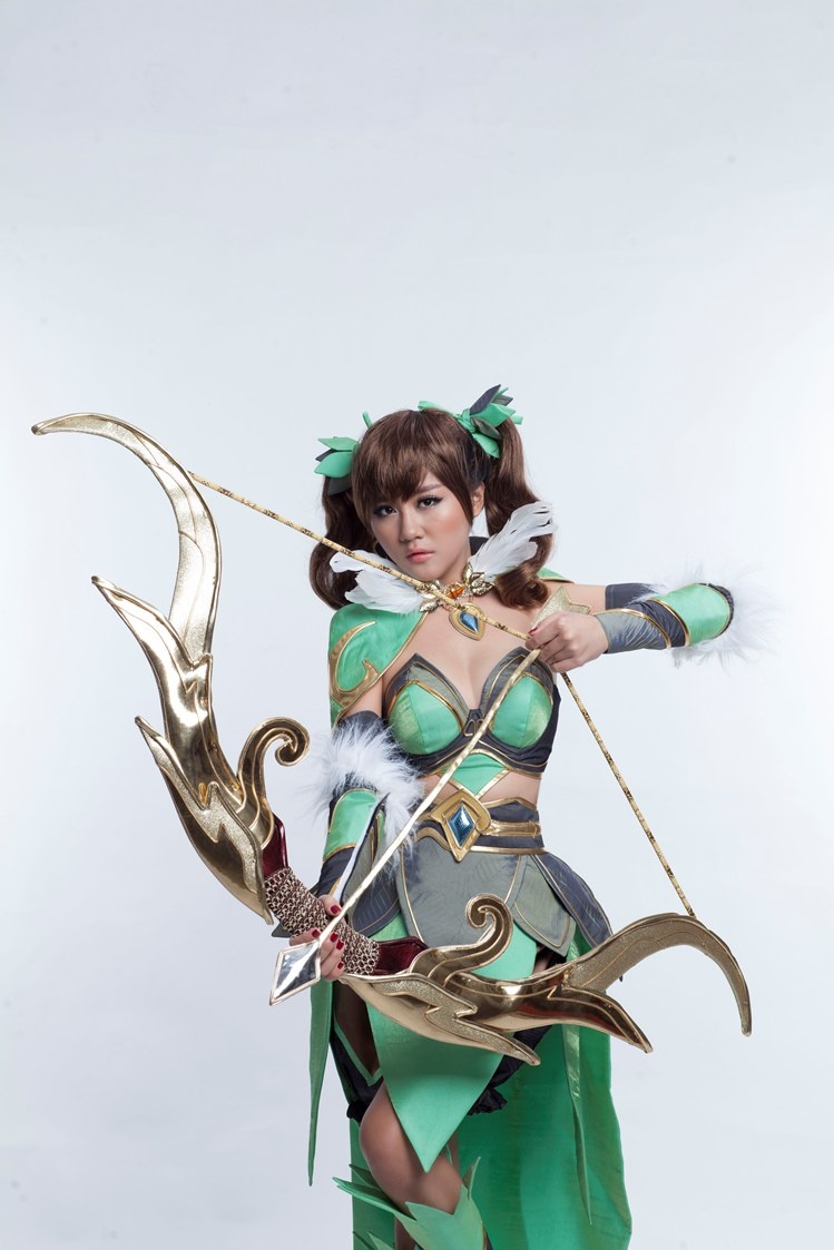 | Dáng vẻ nhí nhảnh, đáng yêu của Văn Mai Hương khi tạo dáng với cây cung. |