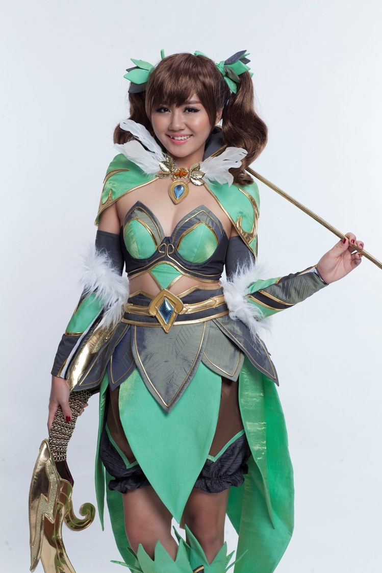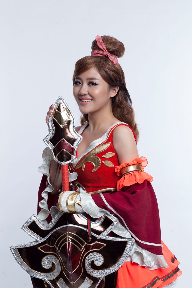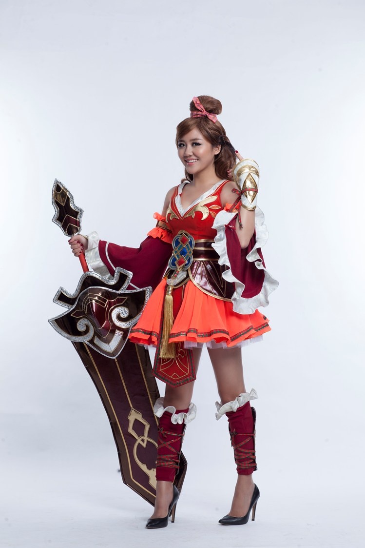 Khác với vẻ lạnh lùng khi hóa thân nhân vật Thiên Sư, Văn Mai Hương trở nên đáng yêu và nhí nhảnh với tạo hình Ảo Vũ và Kiếm Cuồng của game Bách Chiến Vô Song.