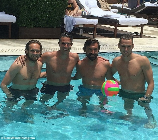 | Van Persie, Blind và De Vrij tình cờ gặp Andrea Pirlo. Cựu tiền đạo của Arsenal đã đăng lên trang Twitter của mình hình ảnh và chú thích: “Cùng với đồng nghiệp và người nghệ sĩ Pirlo”. |