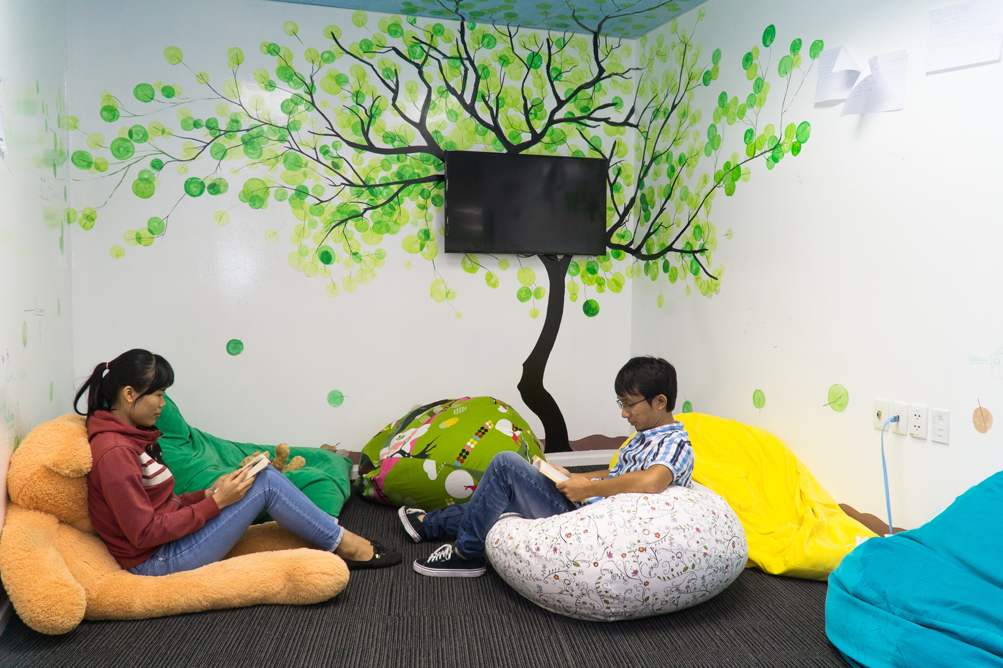 | Ghế gỗ, xích đu, kệ sách được bố trí gần khu vực làm việc để nhân viên có thể trao đổi riêng, tiếp khách hoặc giải lao. |