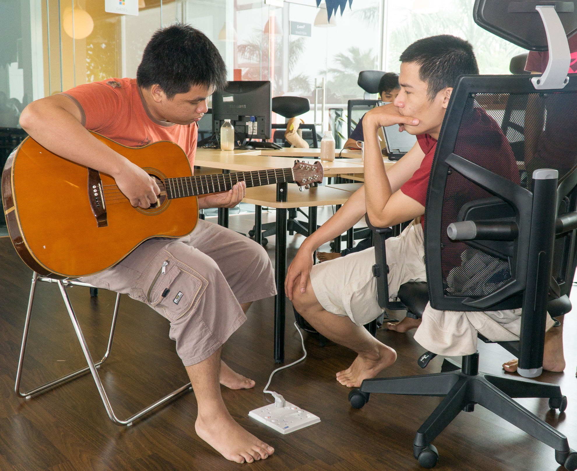 | Nhân viên có thể tranh thủ chơi đàn và các hoạt động nhóm trong giờ giải lao. |