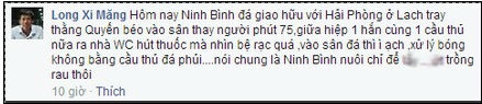 | Văn Quyến ngồi dự bị trong trận đá tập của Ninh Bình và bị cổ động viên bắt gặp hút thuốc lá trong phòng vệ sinh. |