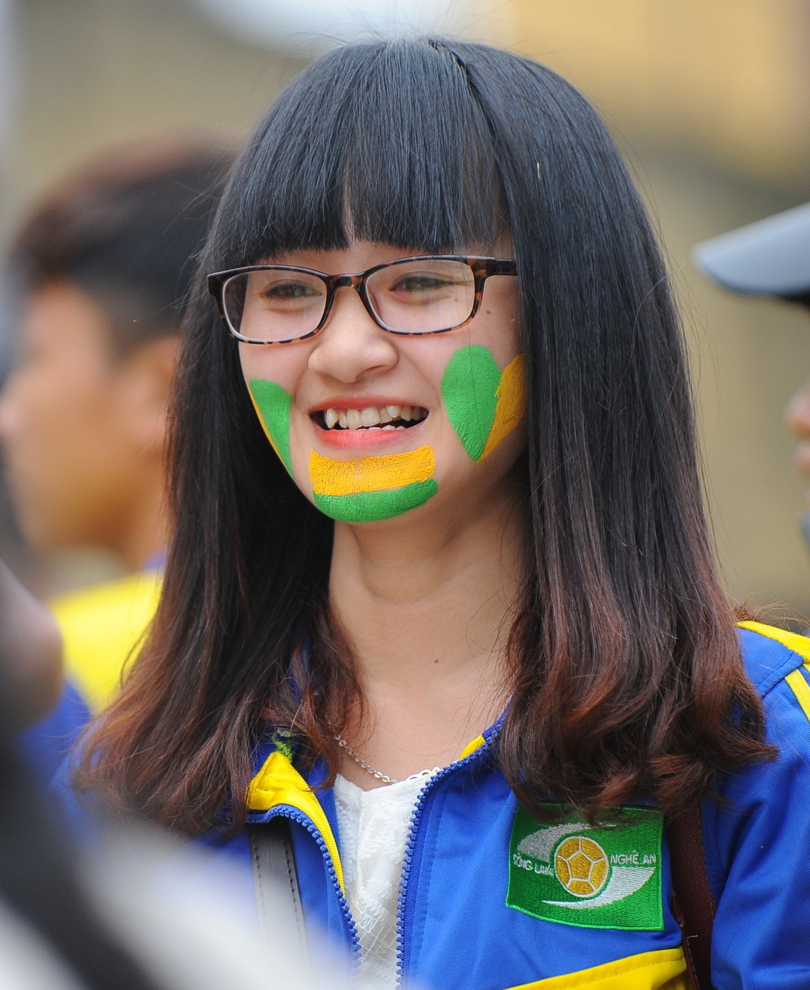 | CĐV nữ SLNA hào hứng khi đến sân Vinh cổ vũ cho đội nhà trong trận gặp HAGL. |