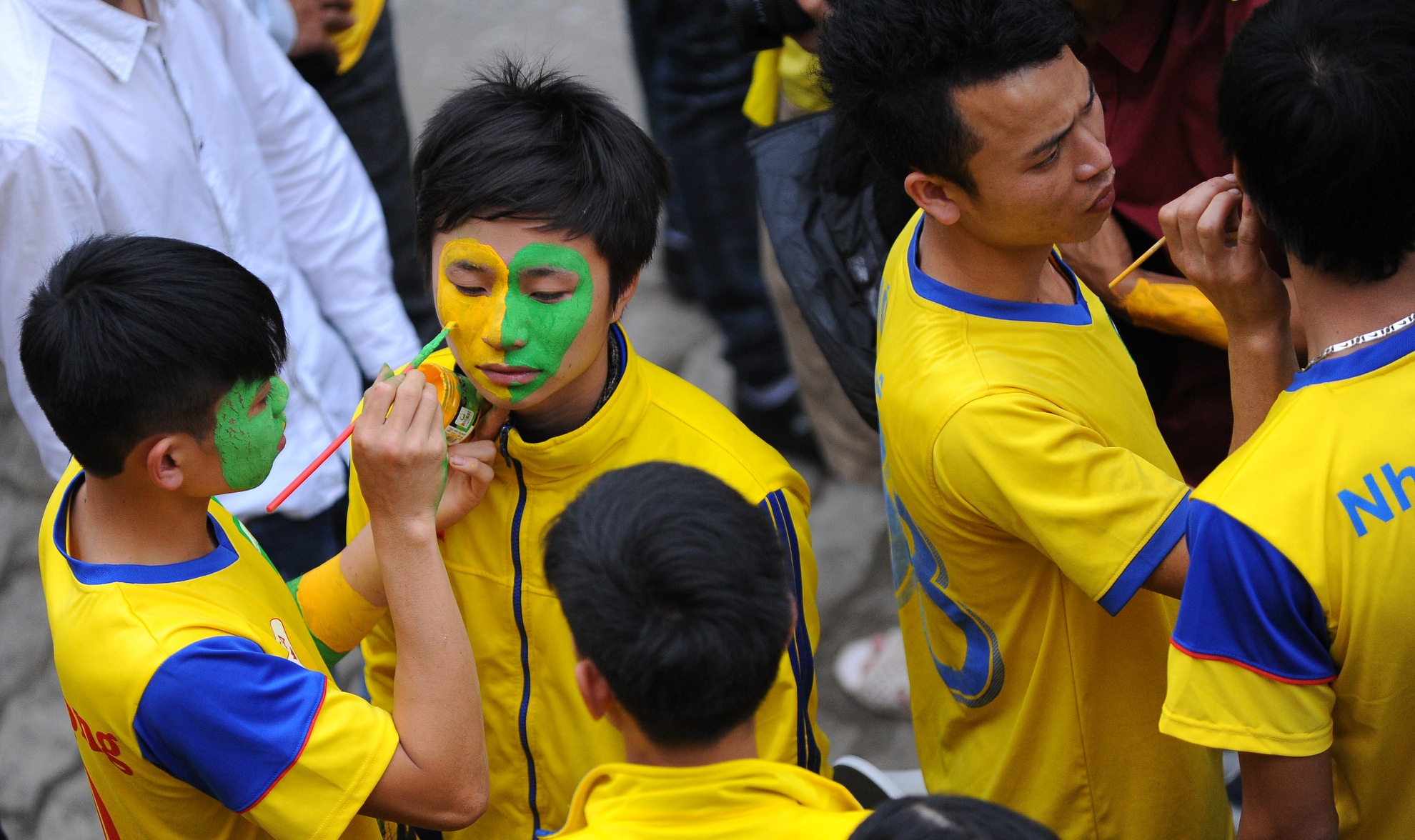 | CĐV giúp nhau vẽ trang trí mặt trước khi vào sân cổ vũ trận đấu. |