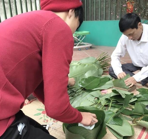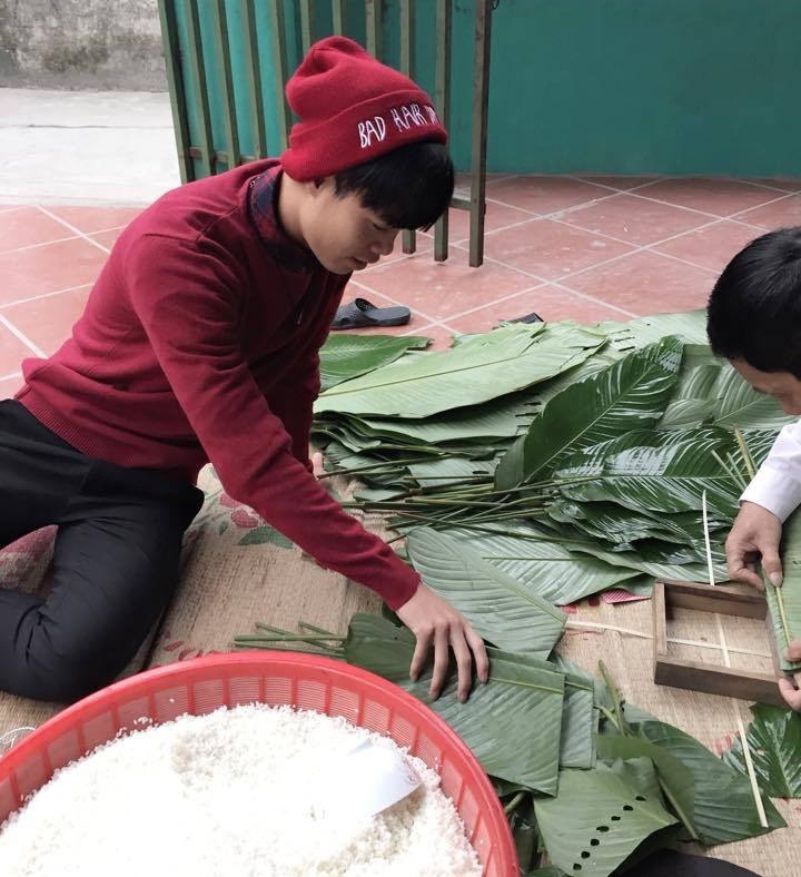 | Sáng 29 Tết, Văn Toàn cùng gia đình ở quê nhà tại xã Thạch Khôi (Hải Dương) chuẩn bị gói bánh chưng đón Tết Ất Mùi. |