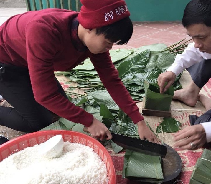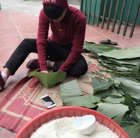 | Văn Toàn sau hơn 4 tháng thi đấu xa nhà được về nghỉ Tết 8 ngày. Tiền đạo trẻ sinh năm 1996 hào hứng khi được gia đình hướng dẫn cách gói bánh chưng. |
