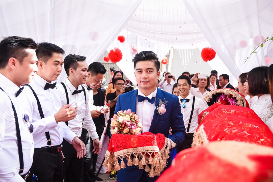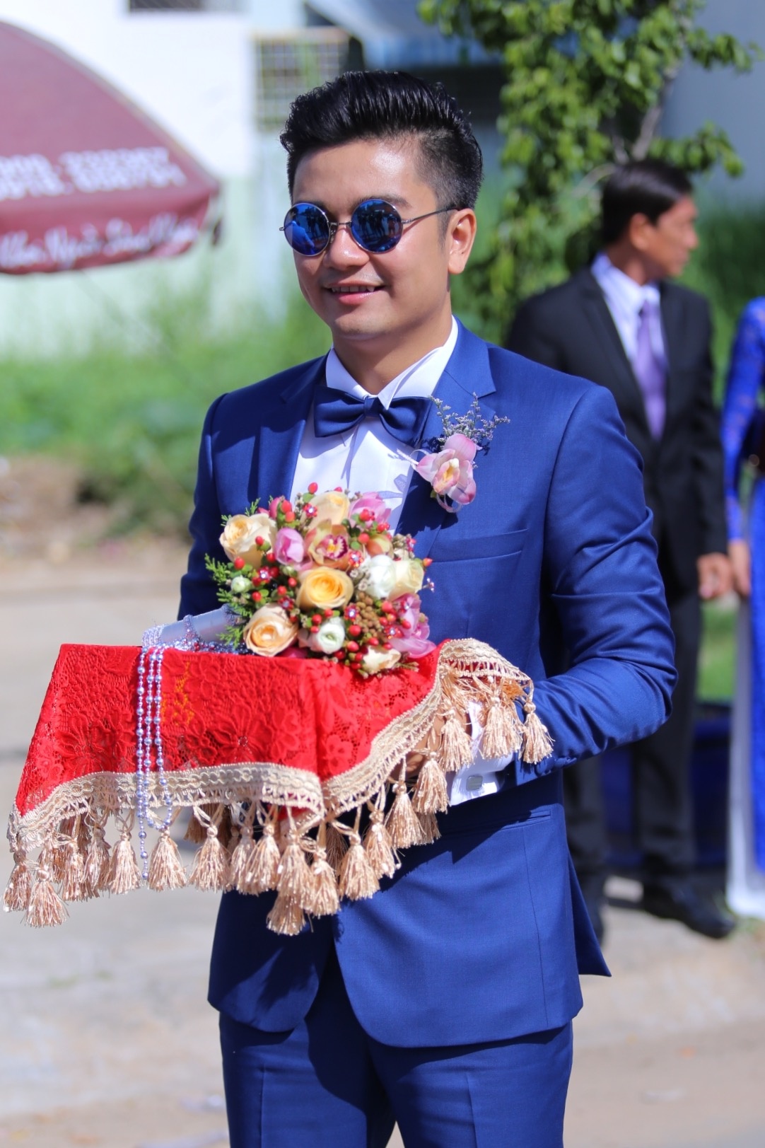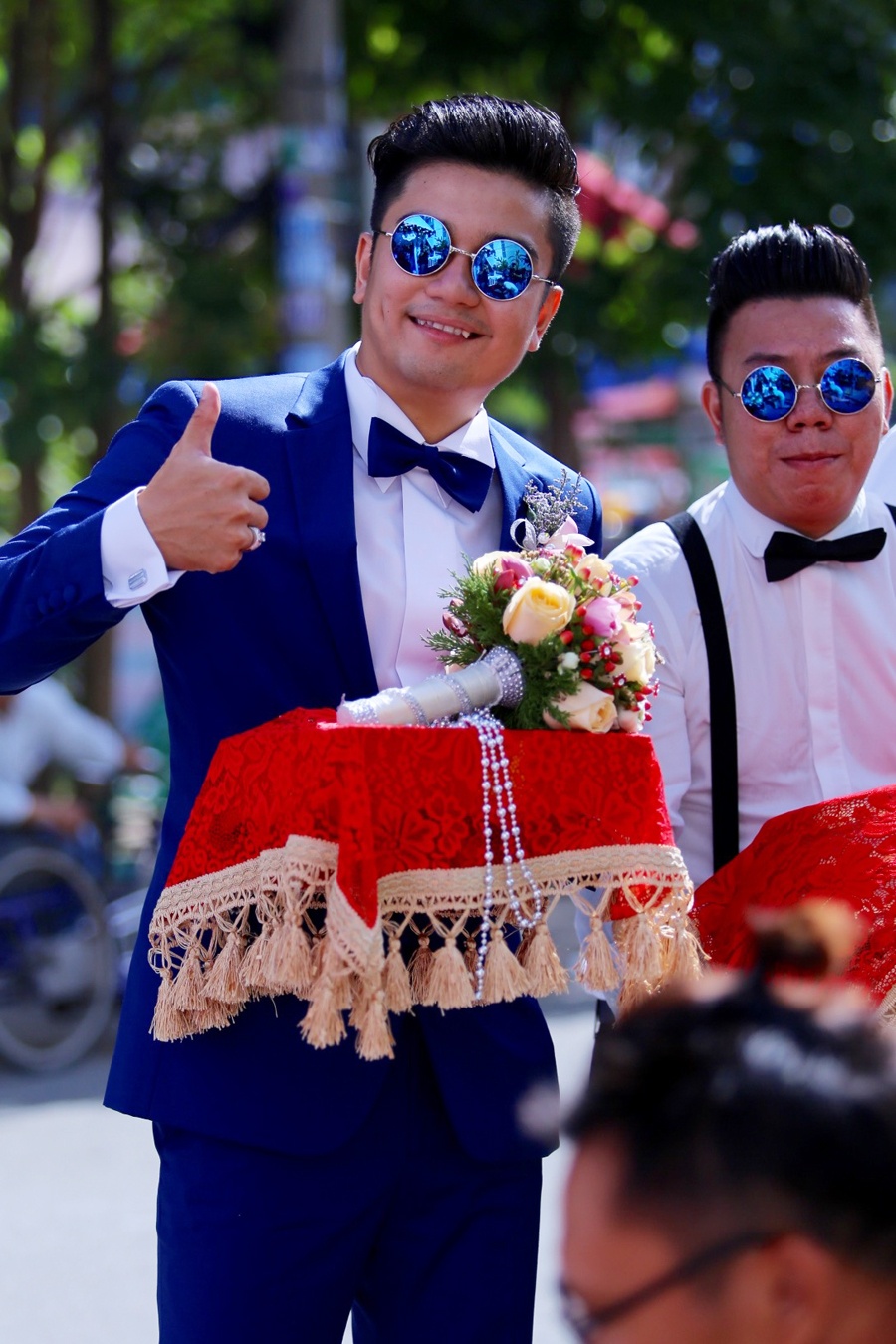 | Đúng 9h, nhà trai có mặt. Chàng trai Việt kiều Australia diện trang phục vest xanh bảnh bảo, anh còn tạo ấn tượng khi đeo kính râm tạo dáng hài hước trước ống kính. |