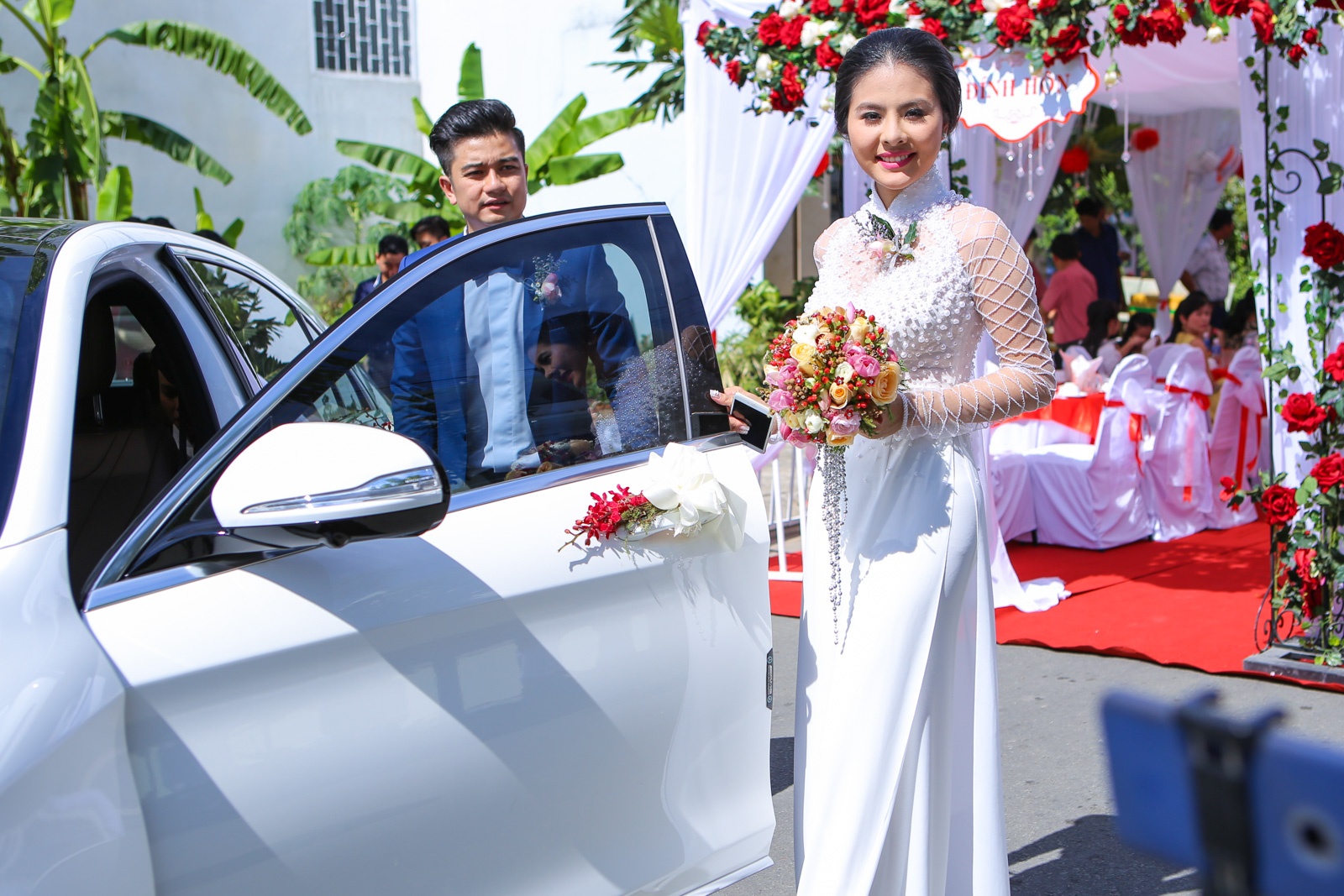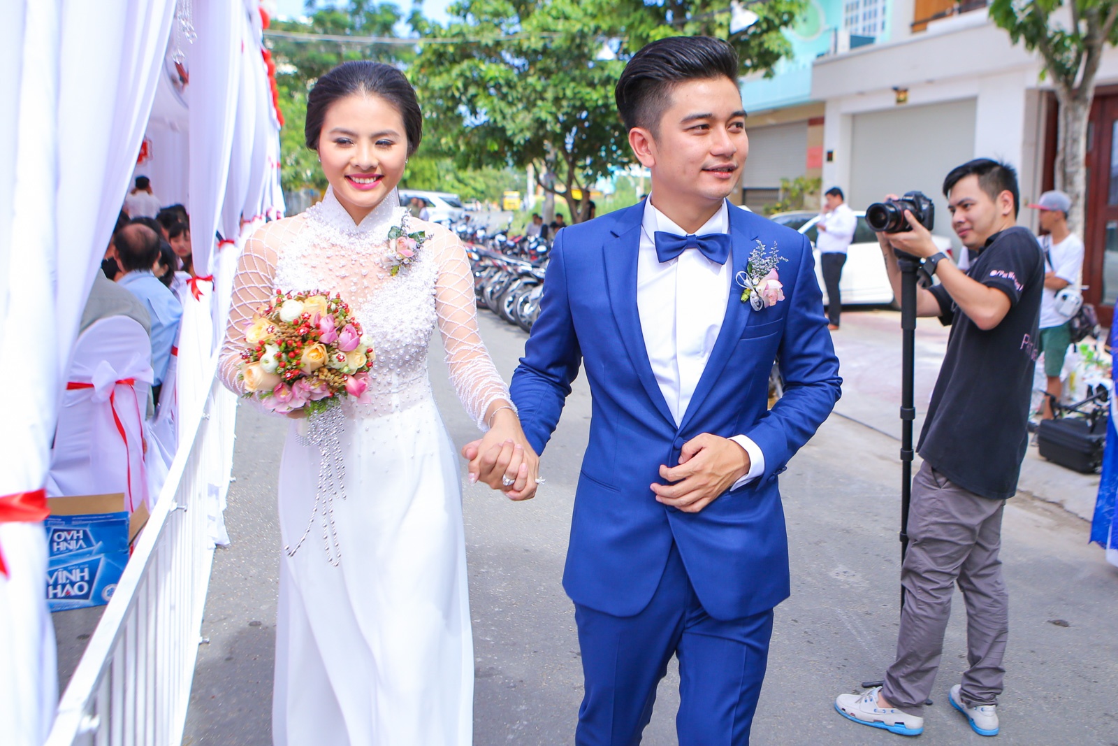 | Cặp uyên ương nắm chặt tay nhau hạnh phúc khi cùng đón khách mời và chào hỏi hai họ. Cô dâu duyên dáng trong thiết kế áo dài trắng, là quà tặng của chuyên gia trang điểm Huỳnh Lợi. |
