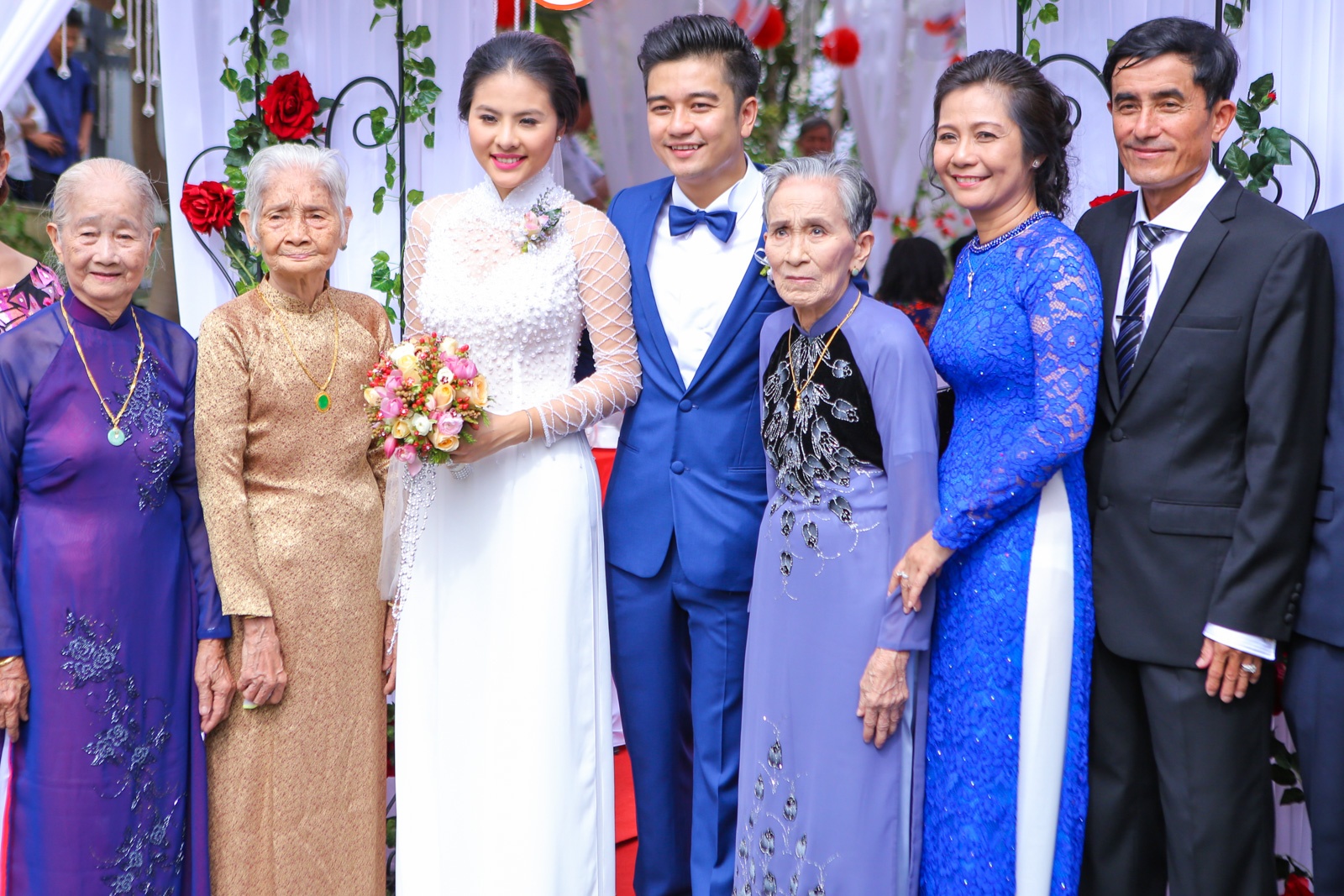 | Cô dâu chú rể rạng ngời khi chụp ảnh cùng bố mẹ, ông bà. |