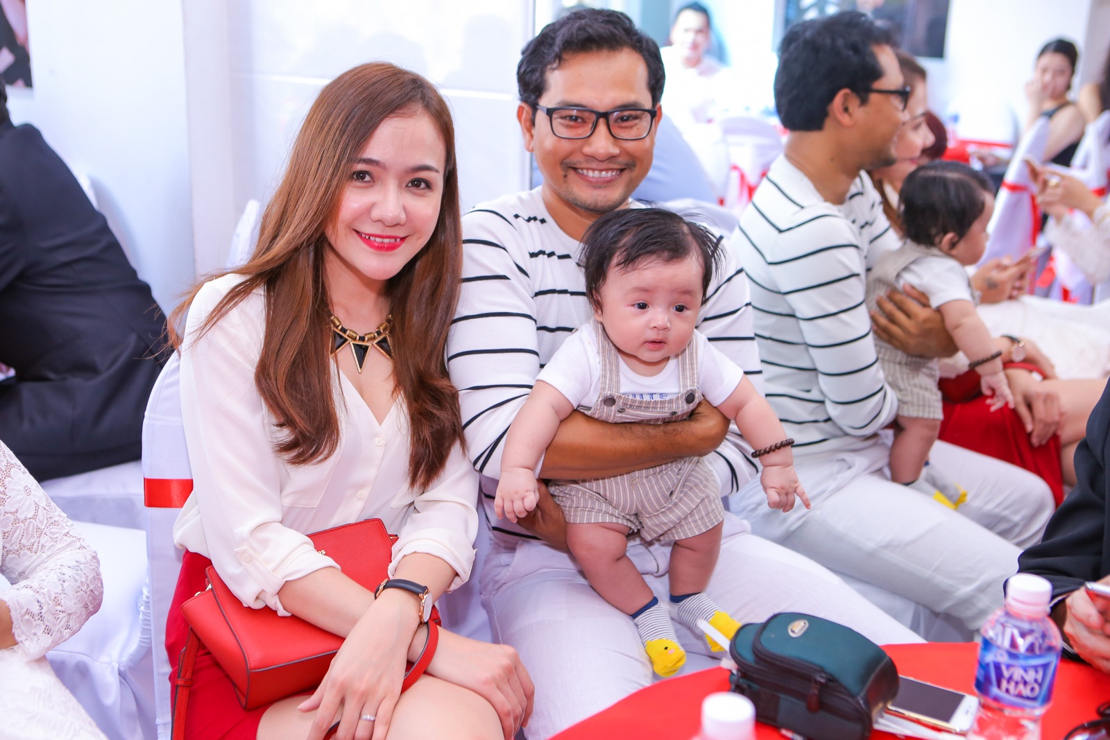 | Vợ chồng diễn viên Huỳnh Đông - Ái Châu cùng con trai chưa đầy một tuổi đến chúc mừng Vân Trang trong ngày vui. |