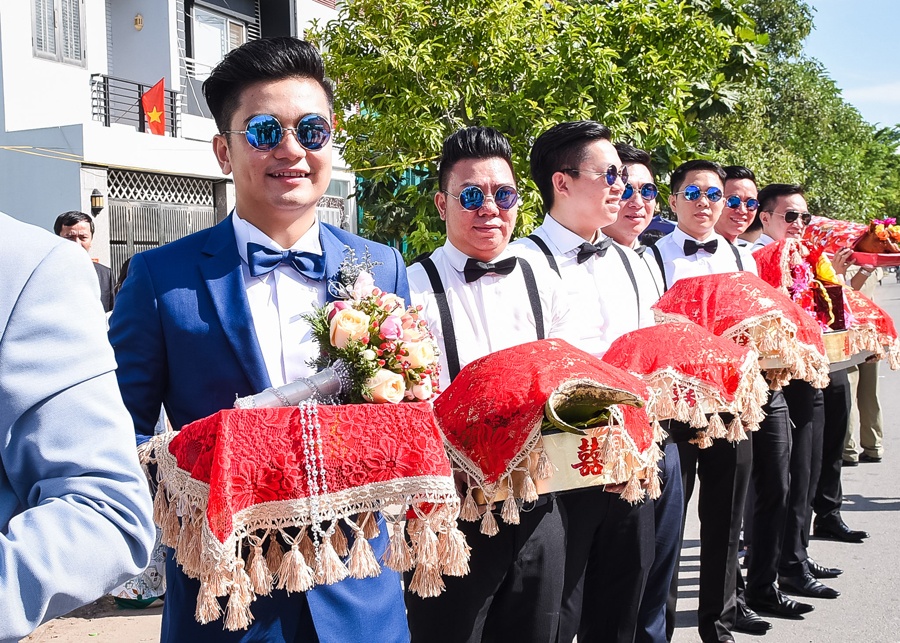 | Đội bê tráp của nhà trai xuất hiện ấn tượng trong trang phục lịch sự, kèm kính râm cá tính. |