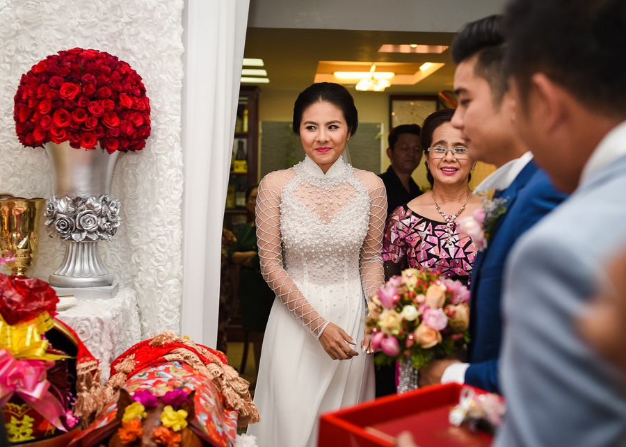 | Cô dâu Vân Trang e lệ khi được mẹ dắt ra chào hỏi hai họ. |