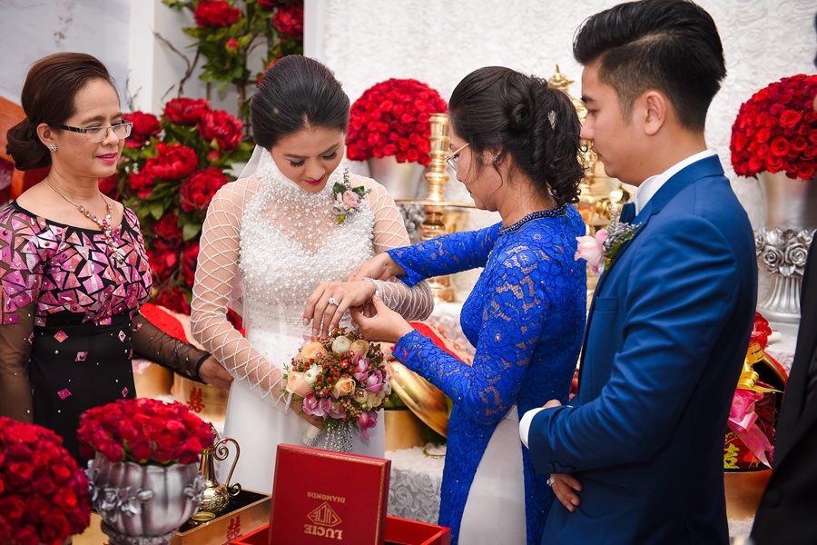 | Mẹ chồng Vân Trang trao quà cưới cho con dâu. |
