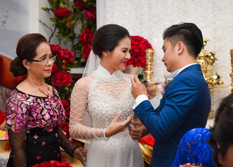 | Chú rể Việt kiều cài hoa lên áo cho vợ rất chu đáo. |