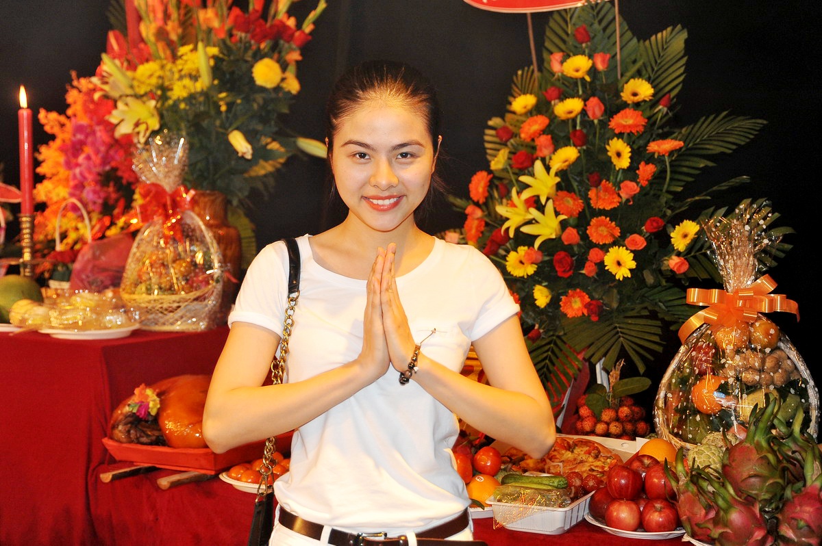 Vân Trang mặt mộc đến cúng tổ sân khấu kịch