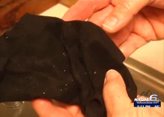 | Những bụi vàng trên tấm vải sau khi một người dân lọc nguồn nước máy trong các hộ gia đình. Ảnh: KTVM6 |